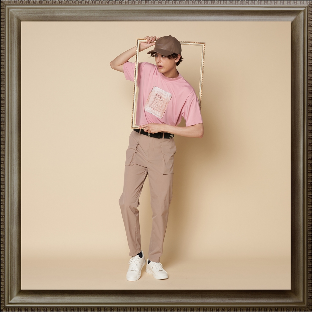 ピンクのグラフィックトップスとモカブラウンの合わせが上品なスタイル。