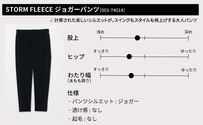 動きやすさと上品さを兼ね備えた大人のための高機能ゴルフパンツ。4方向への優れたストレッチ性に加え、撥水性・透湿性・防シワ性を備えた多機能素材「ストームフリース」を採用。ソフトな肌触りで快適なプレーを約束します。裏側の凹凸構造が肌離れを良くし、ラウンド中のムレやベタつきを軽減。計算された美しいシルエットがスイングの動きを妨げず、大人の気品を演出します。上質な素材感と丁寧な仕立ても魅力。豊富なカラーバリエーションからお気に入りを選び、自分らしいゴルフスタイルをお楽しみください。