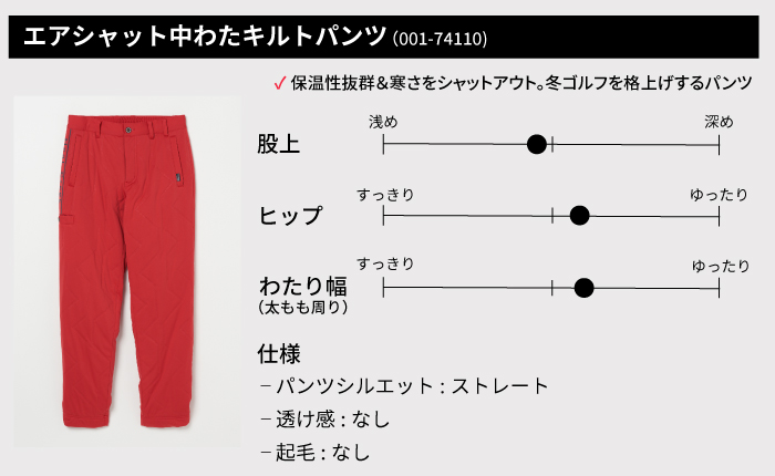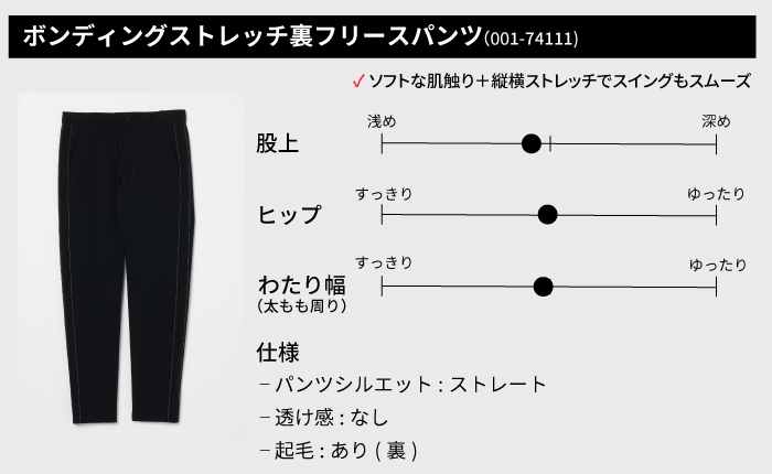 冷え込みが増す初冬から冬のラウンドには、防風性や保温性に優れたパンツがおすすめです。