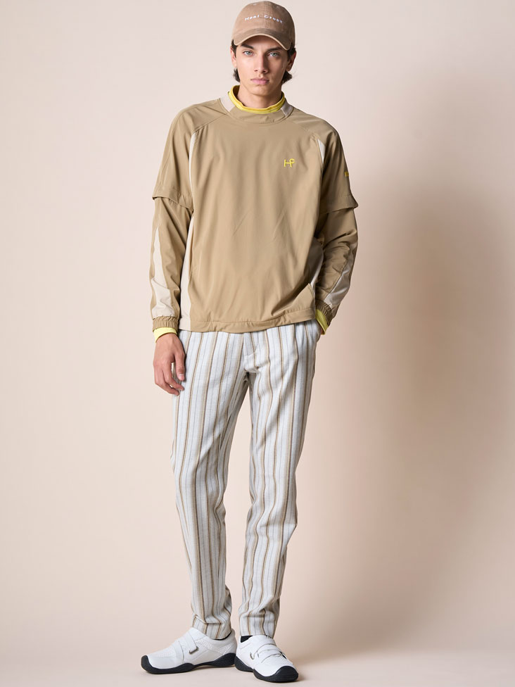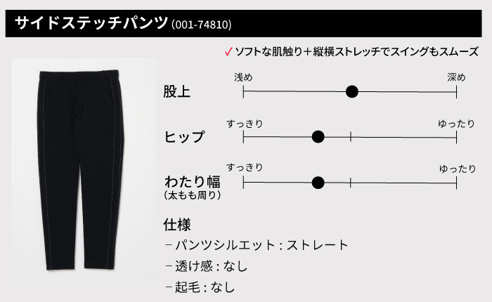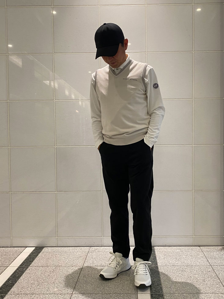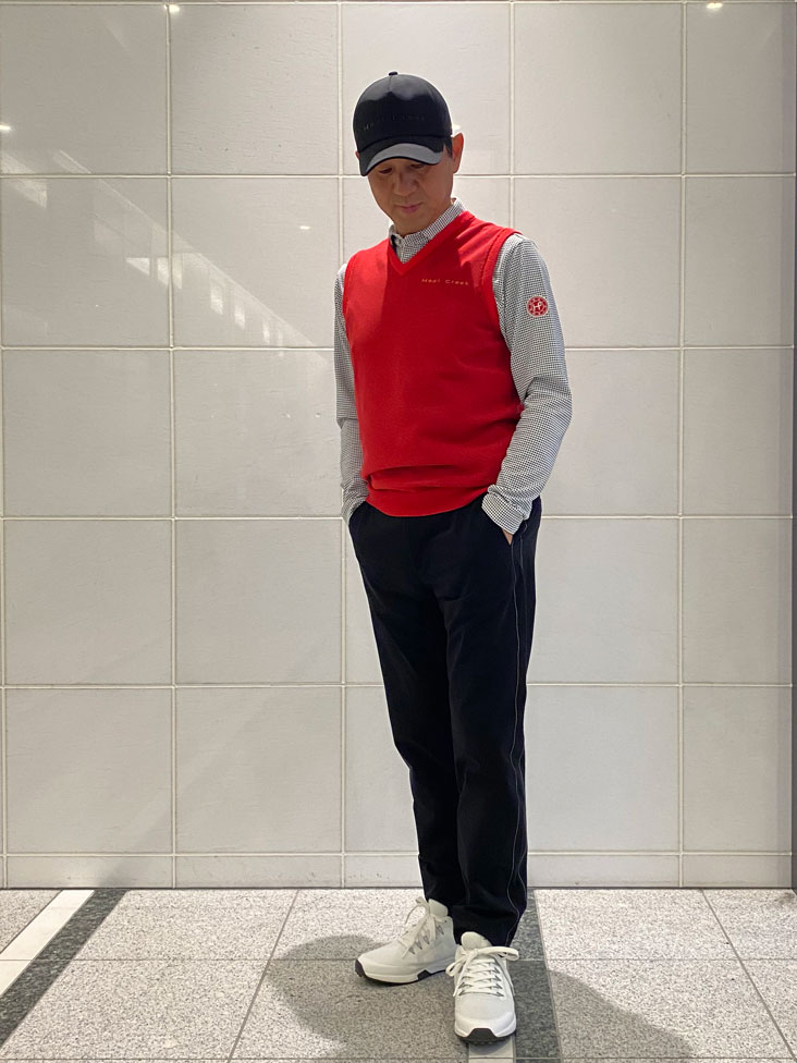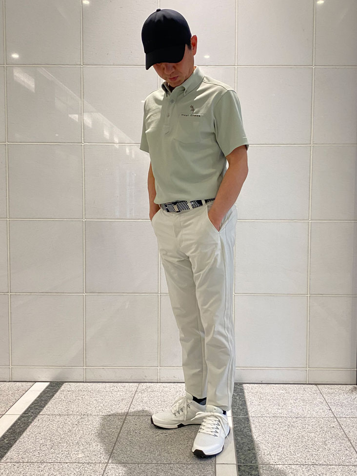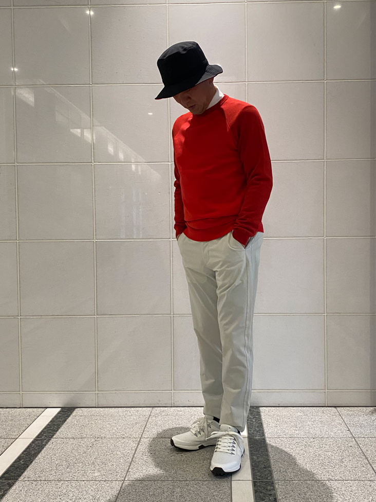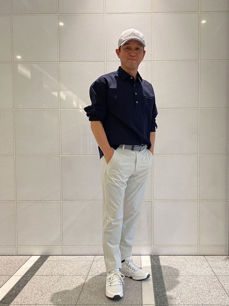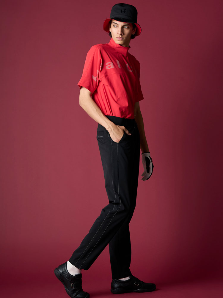 横田プロ着用コメント「この新作シャーリングパンツは、とにかく軽くて本当に快適です。裏地のメッシュが汗をかいてもサラッとした着心地を保ってくれます。 テーパードシルエットのおかげで脚がすっきり見えて、ラウンド後にそのまま街に出ても違和感なし。 上質なゴルフスタイルを求める大人の男性に、ぜひ試してほしい一本ですね。」