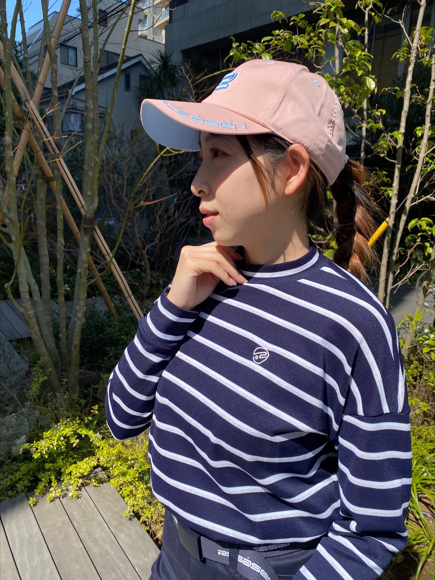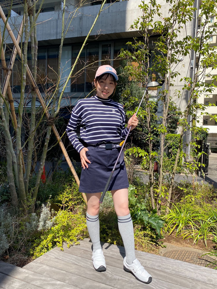 トレンド感のあるドロップショルダーのシルエットに、機能性も充実した長袖ボーダーシャツとロサーセン定番のチノスカートを合わせたコーディネートが春らしく、今の時期にぴったりです◎