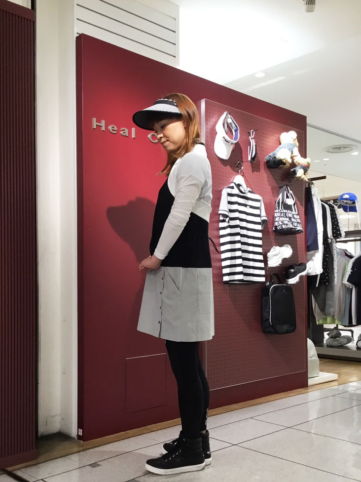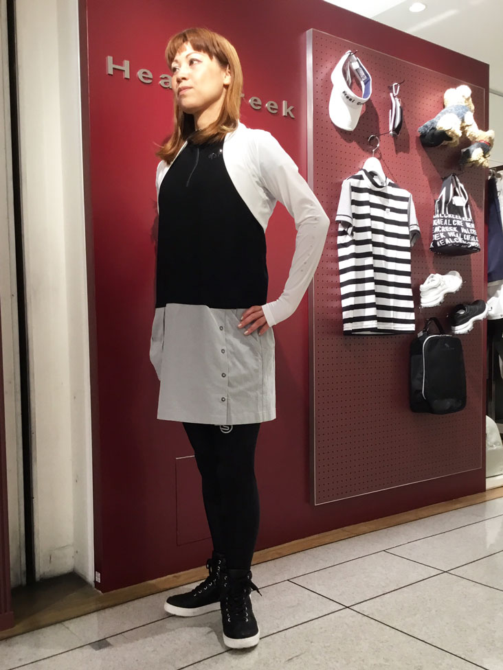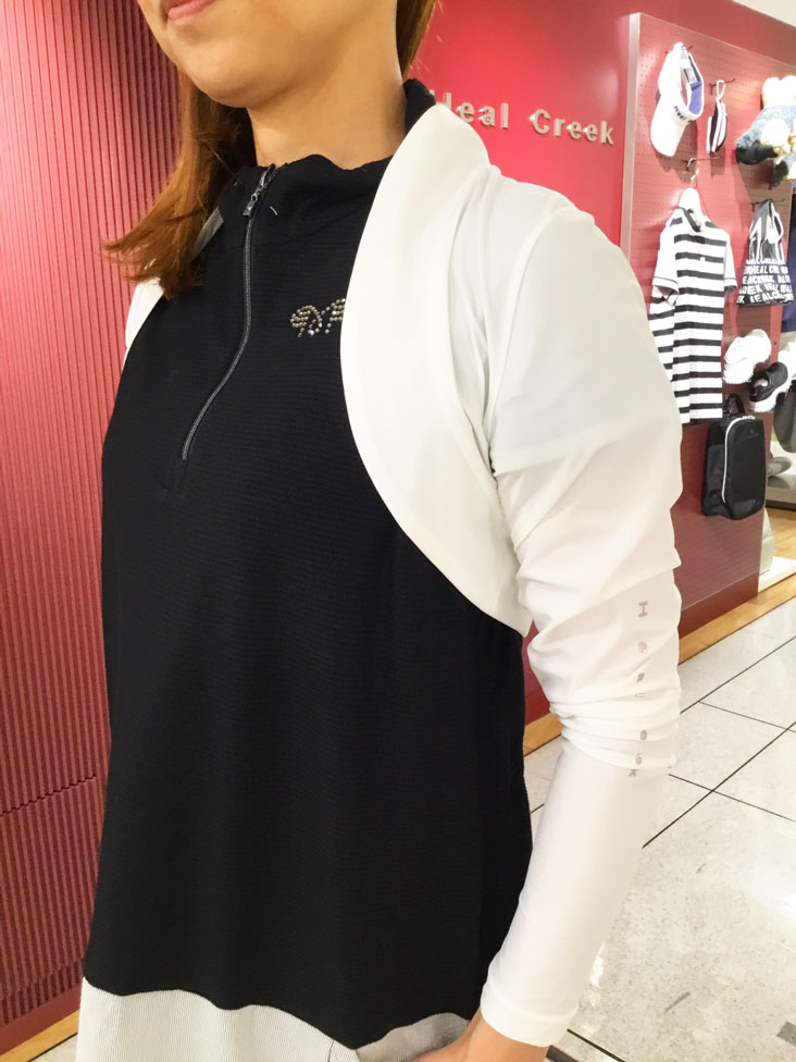 夏のゴルフにおすすめ素材で、1枚でもかわいいワンピース。ギンガムチェックバイザーでかわいさアップ!!ボレロを着て日焼け対策もバッチリ。