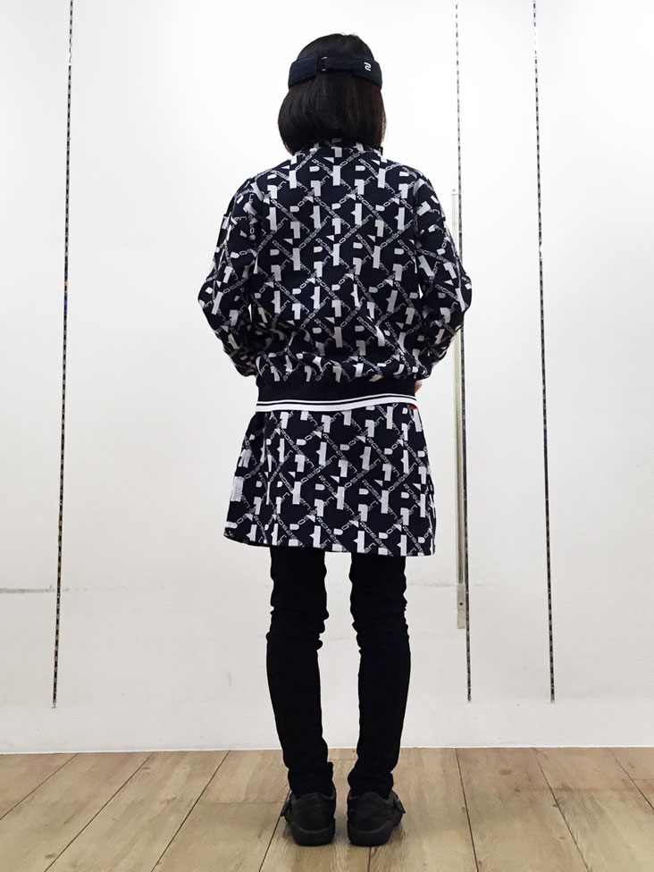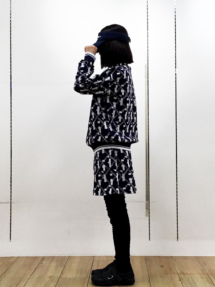 トレンド感のあるドロップショルダーとスカートのモノグラムコーデ。