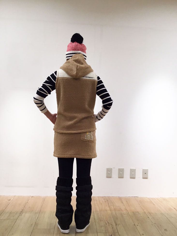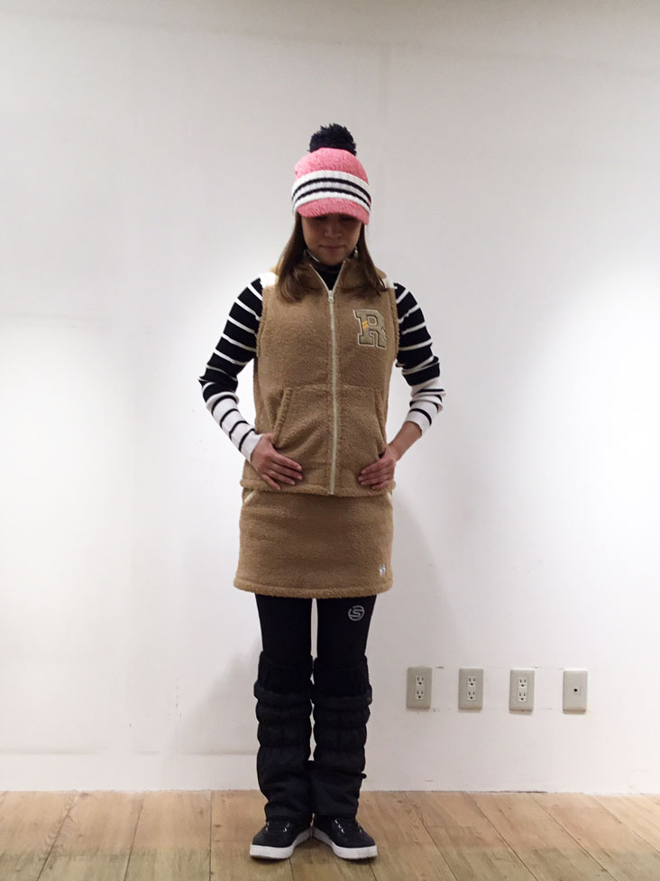 テディベアのようにかわいいコーデ。タートルネックで首元、レッグウォーマーで足元を暖かく冬のゴルフにおすすめ!!