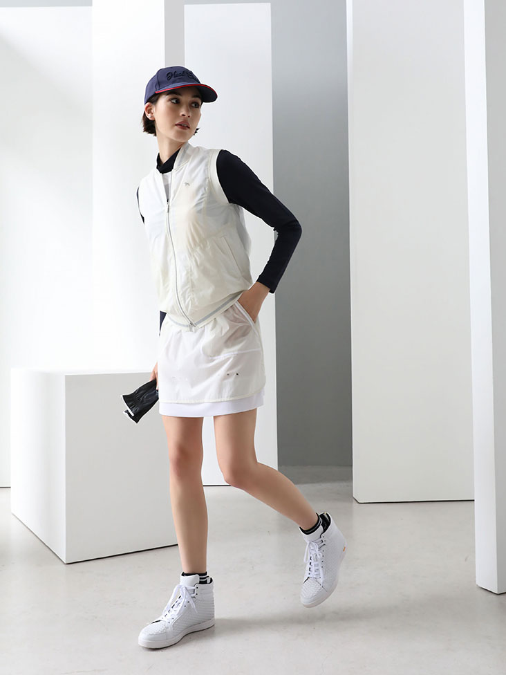 極細ナイロンにポリウレタンをカバーリングした最軽量の2WAYストレッチ素材を使ったライトベストとスカート。ゴルフに必須な撥水機能は繊細なコーティング仕上げで風合いをkeep。裏地は銀イオンに優れた抗菌効果により様々な菌の増殖を抑制するとともに吸水速乾性も併せ持ったメッシュ生地を採用し衣服内環境を快適に保ってくれます。セットアップとしても単品でも使用できコーディネートの幅が広がる。