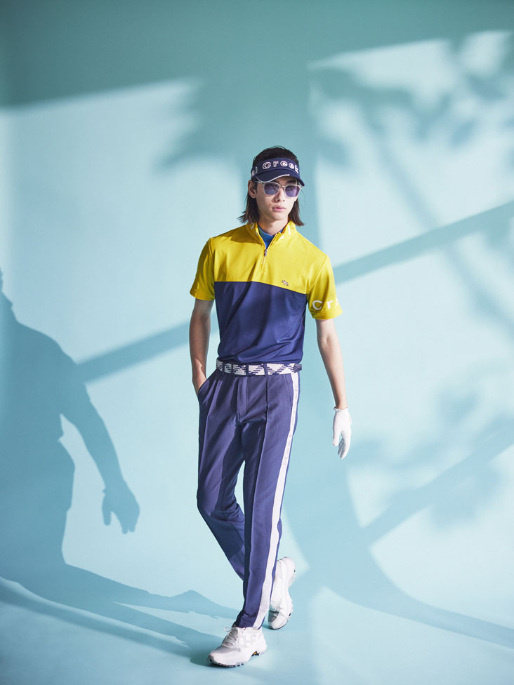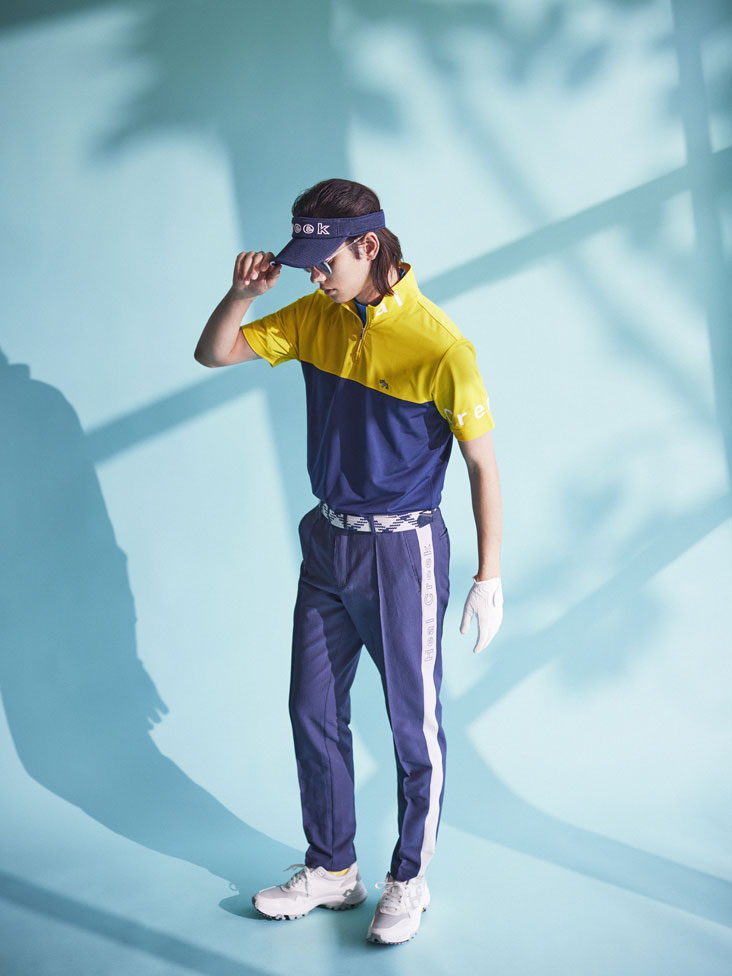 海外の大学のカレッジウェアを思わせるカラーリングのイエロー×ネイビーの切り返しハーフジップトップスにネイビーのサンバイザー、ネイビーのシアサッカー素材のパンツ、ホワイトのベルトやシューズを合わせたスタイリングです。