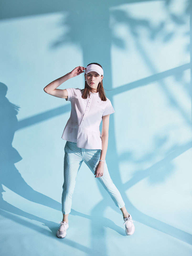 切り替えにチュールを挟み込んだトップスは、広がりを抑えたフレアでスタイルアップにも。パンツは軽量生地のため暑い時期にぴったりの1枚。同生地のメンズハーフパンツと、お揃いで着ていただくのもオススメ。