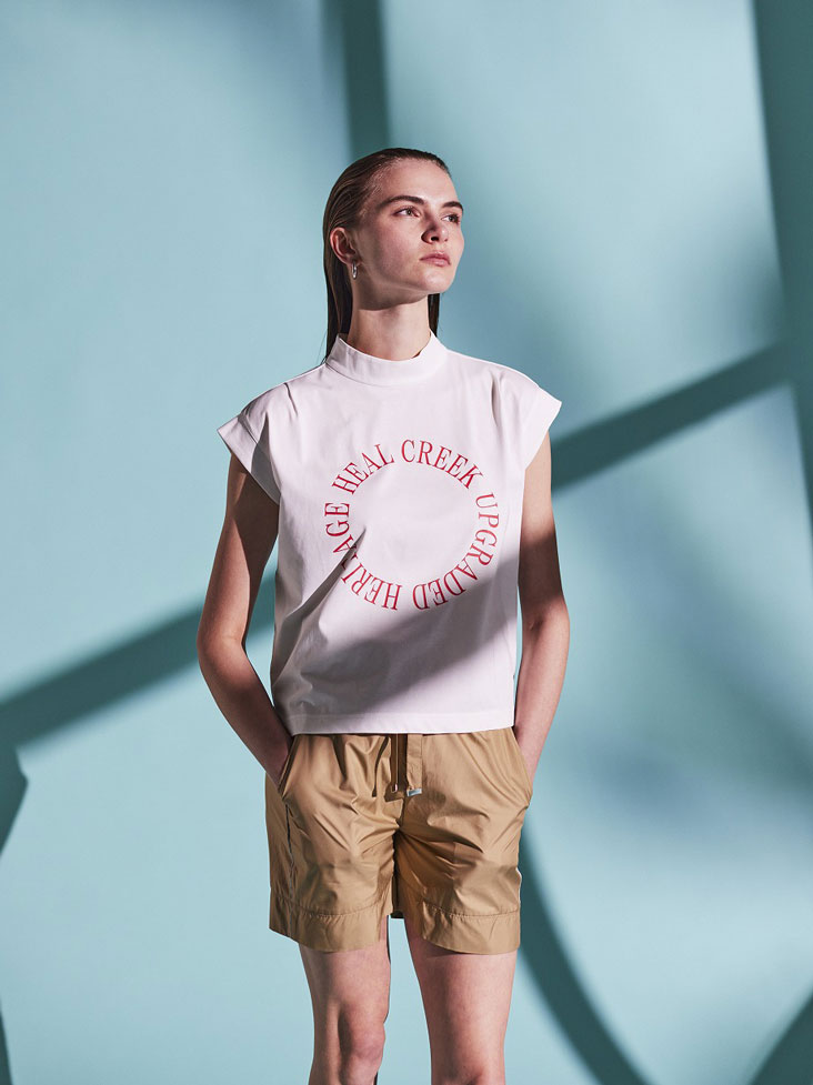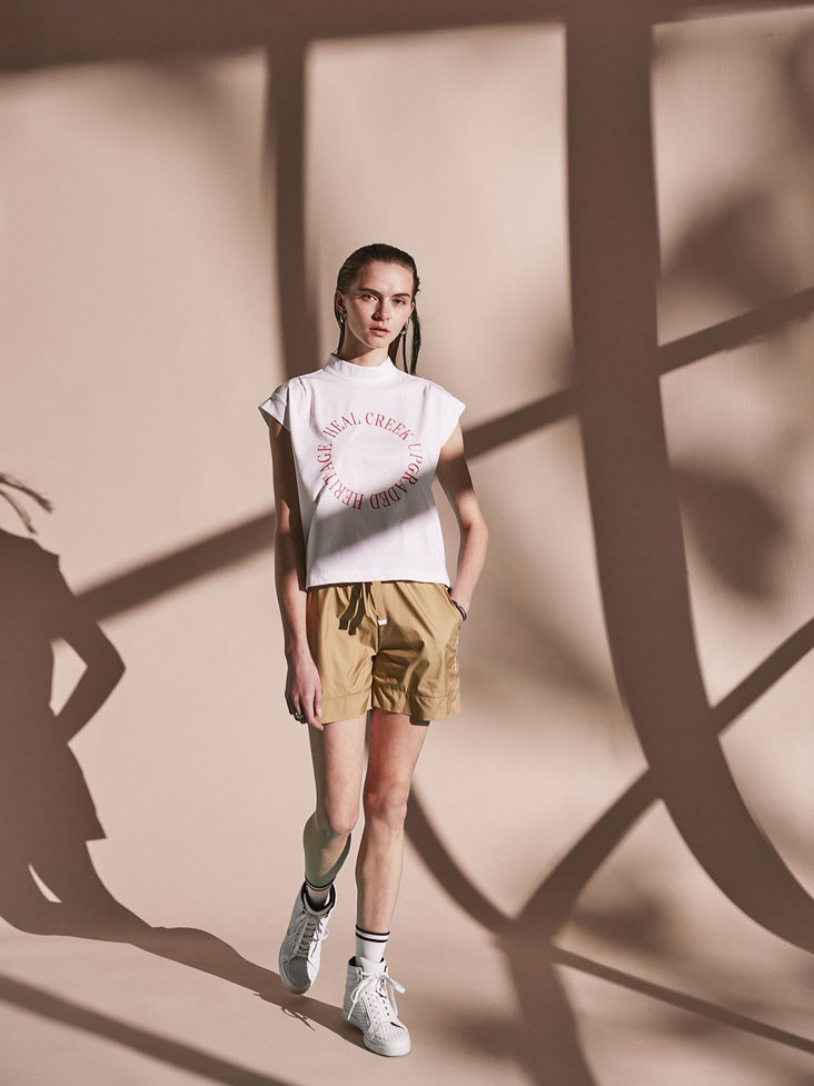 肩にまで袖がついたタイプの半袖モックネック。ゆったりとしたシルエットで風通しが良いアイテム。パンツは柔らかな光沢のキュロット。脇にはいったパイピングが、ゆったりとしたコーデのアクセントになっています。