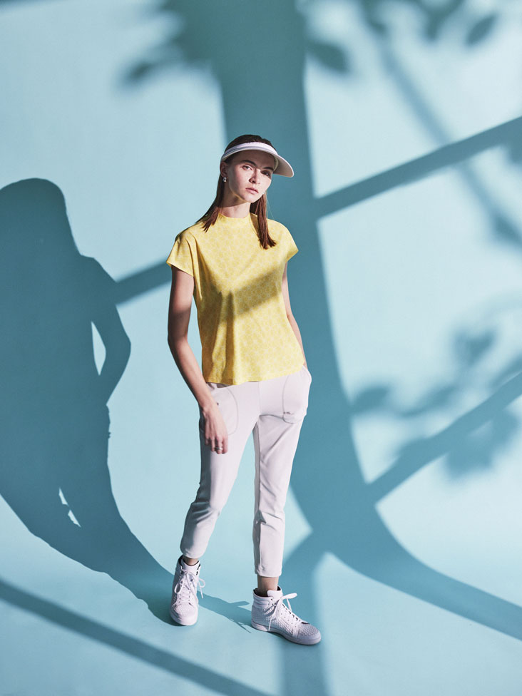 ビンテージ風の総柄プリントシャツが涼しげな印象を与えてくれるコーデ。接触冷感・UVカット機能のある素材を使用。パンツは軽さと高いストレッチ性があり、体の動きの邪魔をしないアイテム。履きこみできるデザインなので、楽に着脱していただけます。