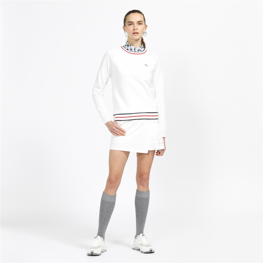 ホワイトにトリコロールラインの入ったスウェットに同じくホワイトのミニスカート、グレーのハイソックス、ホワイトのシューズを合わせたスタイリングです。スウェットの首元と裾にトリコロールラインが配されており、1枚で着用してもインパクトのあるデザイン、ミニスカートのプリーツ部分にはレース素材が使用されており、エレガントさを感じさせます。クラッシックなテニスルックを彷彿とさせるスタイリングのインナーには、ネイビーのジオメトリックフラワープリントのジップアップハイネックトップス、大きめの円形ピアスを合わせて、クリーンでモード感溢れるスタイリングに演出しました。