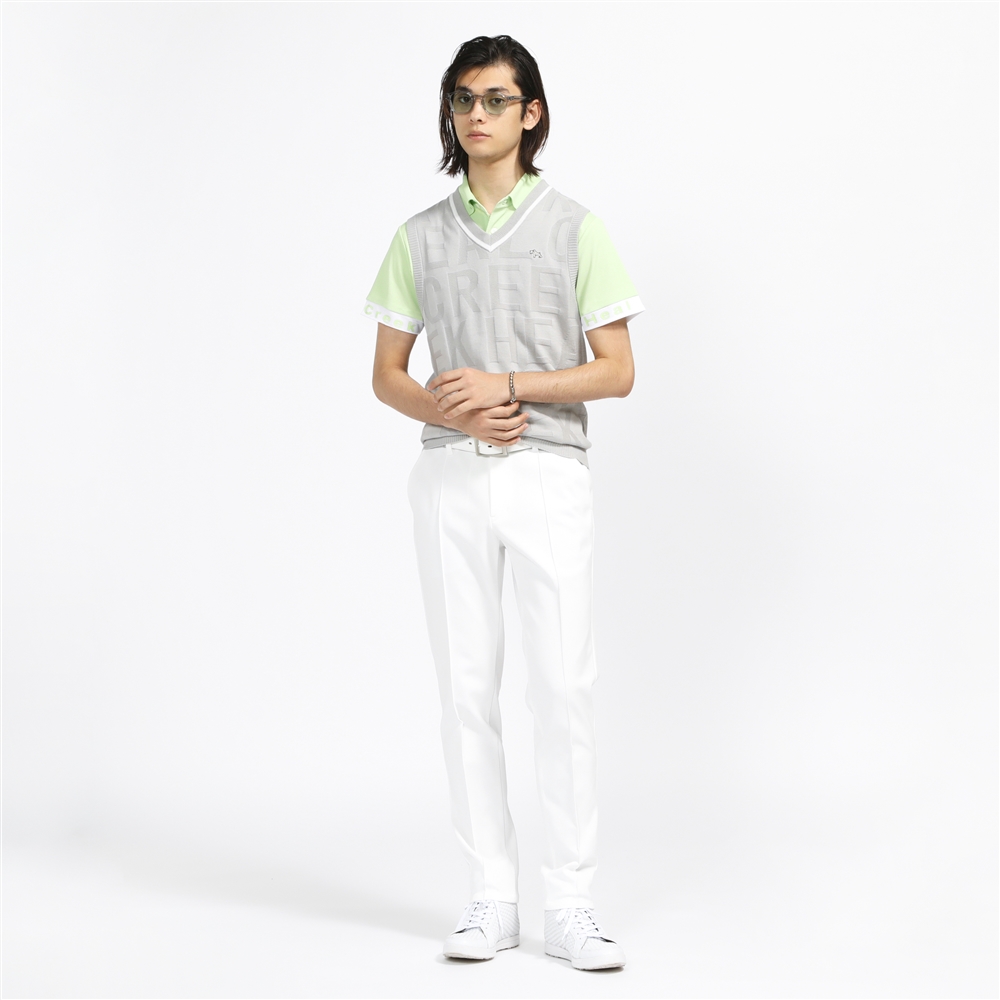 2023SSシーズン評判の良いカラーのペールグリーンのポロシャツにペールグレーのブランドメッセージ入りニットベスト、ホワイトのパンツ、ホワイトのシューズを合わせたスタイリングです。ポロシャツの袖先にも切り返しやブランドロゴが配されており、1枚で着用しても様になるアイテムです。ニットベストのロゴ部分はガーター編みでさりげなくロゴを主張、他はフラットな天竺編みとなっております。クリアーセルフレームにシアー感のあるグリーンカラーレンズのサングラスを合わせ、全身を淡い色味でまとめることにより、2023SSらしい洗練されたワントーンスタイリングになっております。