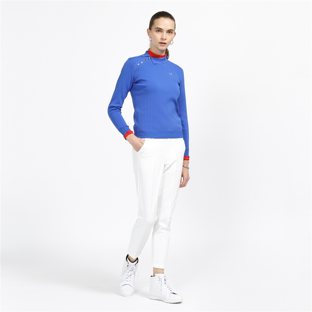 胸元部分のアシンメトリーデザインが特徴的なロイヤルブルーの長袖リブニットのインナーに、レッドのハイネックトップス、ホワイト9部丈パンツを合わせたスタイリングです。トップスのアシンメトリーデザインや素材感、ボタン使いで、洗練されたデイリーウェアにもなりえるテイストのスタイリングを、全身トリコロールカラーで表現したスタイリングになります。合わせるシルバーアクセサリーやホワイトのシューズで、華やかさと上質さを演出しております。