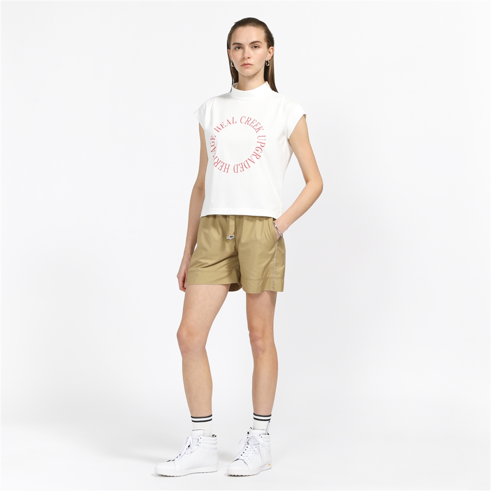 肩にまで袖がついたタイプの半袖モックネック。ゆったりとしたシルエットで風通しが良いアイテム。パンツは柔らかな光沢のキュロット。脇にはいったパイピングが、ゆったりとしたコーデのアクセントになっています。
