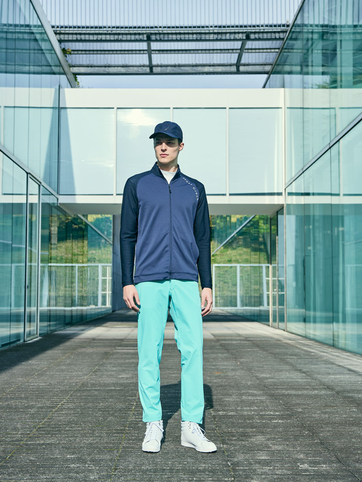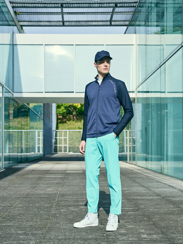 ファッションにおいて、色の組み合わせは重要な要素です。ネイビーのアウターとアクアグリーンのパンツという絶妙な色合わせのコーディネートは、その洗練された印象とバランスの取れた配色により、一際目を引きます。アウターは、抜群のストレッチ性と涼しげなメッシュ目が特徴で、フルジップデザインにより、どんなスタイルにも簡単に合わせることができます。その着易さに驚くことでしょう。一方、インナーシャツは程よい厚みで安心感をもたらし、リラックス感のある素材を使用しています。ネイビーのサークルロゴキャップとハイカットシューズというアクセサリーの選択も、スタイリングに独自性と個性を加え新たな着こなし案と魅力的なスタイリングを提案。