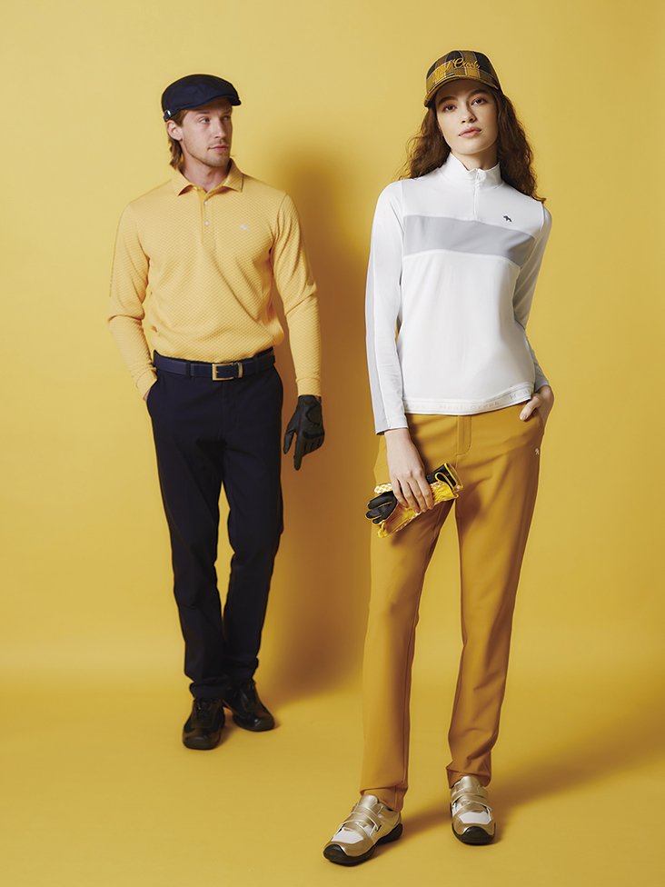 メンズ・・・ワッフルのような凹凸のある表面感が一枚でも存在感がばっちり。着心地もよく素早く乾き、コットンのような風合いで快適です。袖口はゴムをつけスムーズに腕まくりできます。パンツは後ろポケットにはグローブホルダー、ゴルフボールが2個入るポケット、ウエストには滑り止めテープ付き、さらには吸汗速乾性もと1枚で何役も活用できます。まだまだ暑い日にスポーティーなスタイリングでお楽しみいただけます。