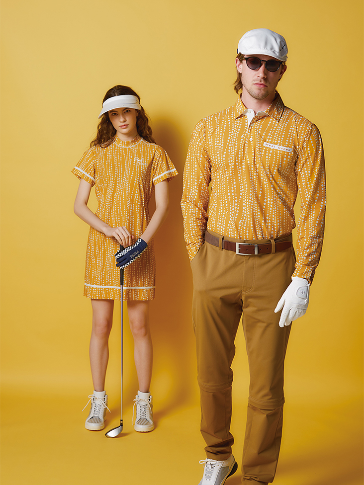 レディス・・・スポーティーなオリジナルのプリント柄のワンピース。薄く軽やかな着心地で、滑らかな肌触り、適度なストレッチ性とキックバック性、形態安定性にも優れイージーケア。夏に嬉しい高機能素材。ドローストリングでウエストを絞るとより女性らしいシルエットにもでき、プレーしやすいシルエットのワンピースは一枚持っていると便利。秋には重ね着もおすすめなので長く着ることができます。オリジナルの柄にはよく見るとヘンリー君が、、、!!