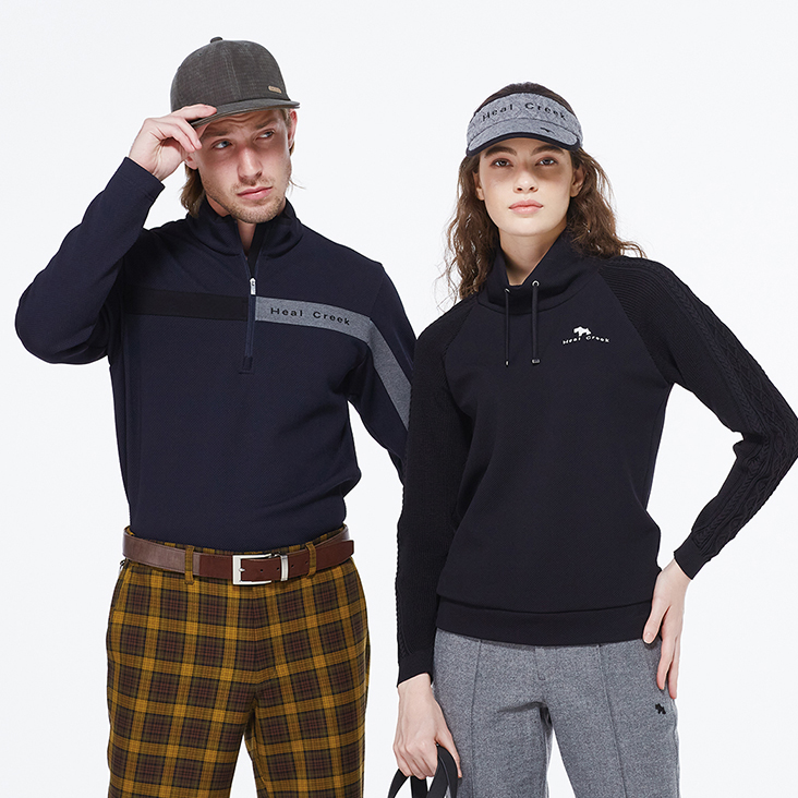 メンズ・・・非対称の切り替えが新鮮で表面感のある素材がポイント。一枚でも重ね着でも着こなしができ、快適なストレッチ性がありゴルフシーンにうってつけ。イエローのチェック柄パンツとあわせてブリティッシュゴルフスタイルをご提案いたします。