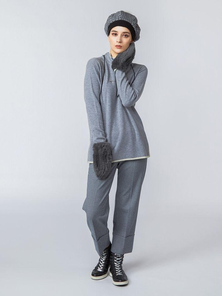 メンズライクなワイドストレートパンツはチェック柄でジェンダレスな雰囲気。サイドにスリットが入った配色ラインでスポーティに仕上がった半梳毛カシミヤ10%入りのニットと合わせることで、上品なスタイルの完成。