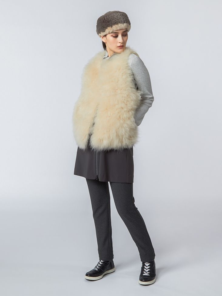 カシミヤ+レッキスのファーベストで、身頃にボリュームが出てゴージャスに演出。ベストワンピースと細身のストレッチボトムを合わせて、シルエットに変化を。