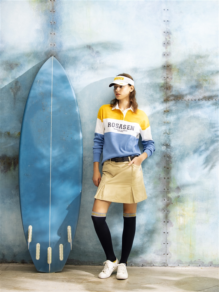 ニットで表現した配色ラガーシャツとプリーツが入ったスカートのスタイル。ニットは肌当たりがいいコットンとドライタッチで清涼感があるポリエステルの混紡糸を、スカートは撥水・ストレッチ機能を併せ持つカルゼ組織の素材を使用。大胆な配色がゴルフ場でも映えるロサーセンらしい大人のカジュアルスタイルを表現したコーディネート。