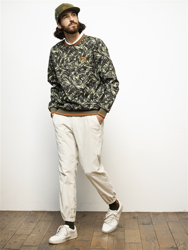 カレッジロゴが効いたスウェットニットと撥水タフタプリントのスニードジャケットの要素を一枚に詰め込んだリバーシブルプルオーバーに、ワイドシルエットの軽量コーデュロイパンツを合わせたスタイリング。特徴的な『グラフィティ迷彩』柄のプリントをウエアやキャップをセットで着用する事でオシャレ感が抜群にUP。シンプルに着たい場合はカレッジロゴ面をメインに街着としてもかっこよく着る事ができる。