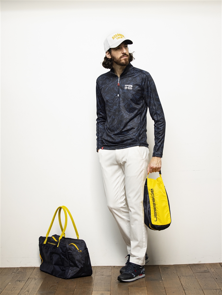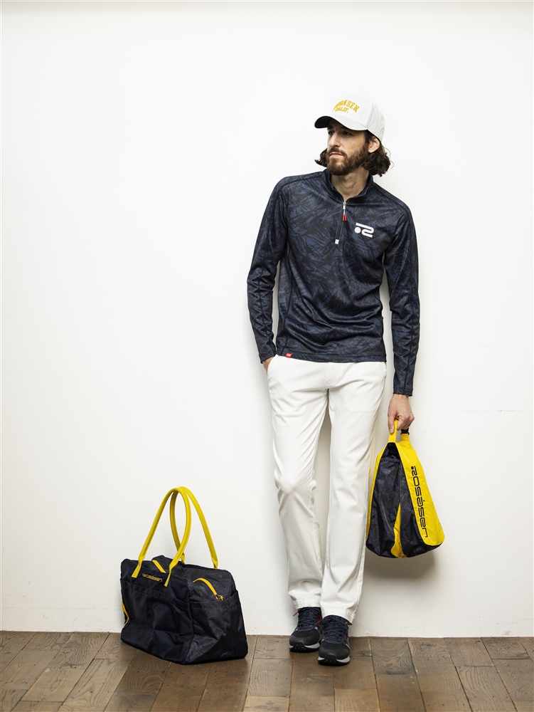 エコベアスムースとよばれる高機能でゴルフに最適な素材に、グラフィティ迷彩プリントをしたスタンドファスナーデザインのトップス。一枚で着用でき、防風機能があるのでインナーとしても活躍。