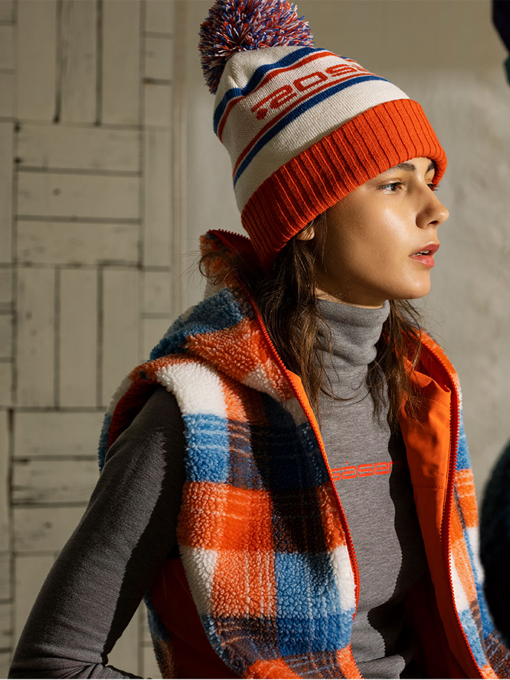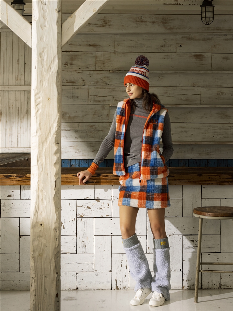 オリジナルチェック柄のボアとタフタのリバーシブルベストと同素材のスカートとのセットアップスタイル。ベストの表面は柔らかさ・ストレッチ・軽量にこだわったエコ素材のボアを、裏面は撥水・ストレッチ機能を持つ素材を、スカートも同ボア素材を使用。間にヒートエナジーという蓄熱シートを入れ、見た目だけでなく機能的にも温かさを実現した冬の新しいアイテム。インナーは吸湿発熱機能のリバー素材で、冬のゴルフが待ち遠しくなるコーディネート。