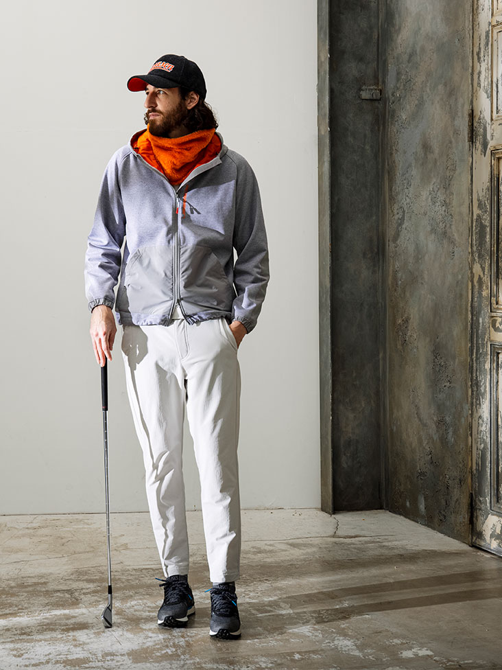 3層ストレッチ素材のフードには中綿とキルトの組み合わせがポイントのジャケットと高機能ストームフリースパンツを合わせ、アウトドアシーンにも活躍可能な機能素材を使ったコーディネイト。一枚でも着用できるインナーのニットは迷彩柄をロゴや衿、袖に入れており、昼間の晴天の気温では一枚で、日が暮れてきたらアウターとネックウォーマーで特徴のある差し色を入れてコーディネイトする事でかっこよくきまる。パンツ素材についてはアウトドアブランドでも使われる素材な為、素材の完成度が高く、普段履きはもちろんマルチなシーンで合わせる事ができるアイテム。