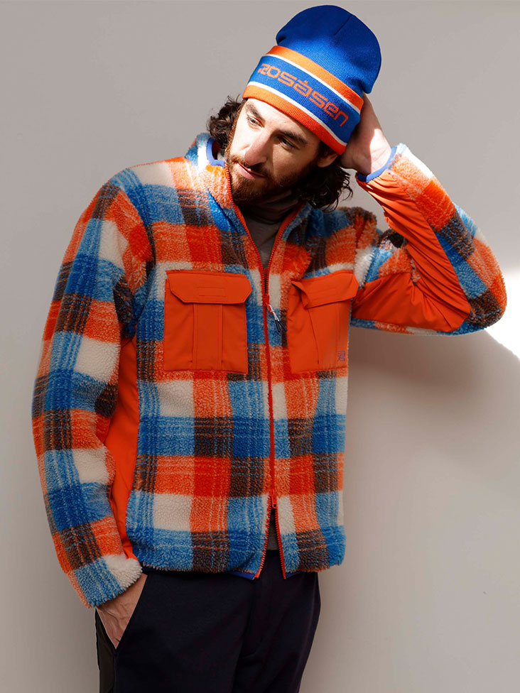 オリジナルチェック柄ボアとタフタを組み合わせたリバーシブルブルゾンと3層に分かれた素材を貼り合わせ作った防風たストレッチパンツ。表面ジャージに防風シート、微起毛フリースを組み合わせた3層ストレッチ素材。タフタとの大きな切り替え、ヒップ部分のすれや摩擦を軽減させる仕様がポイント。シンプルなデザインながらも完全防風仕様で高機能。ブルゾンカラーに合うニット帽とコーディネイトする事でよりスタイリッシュに。