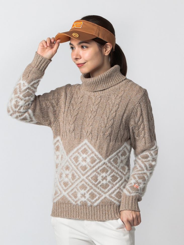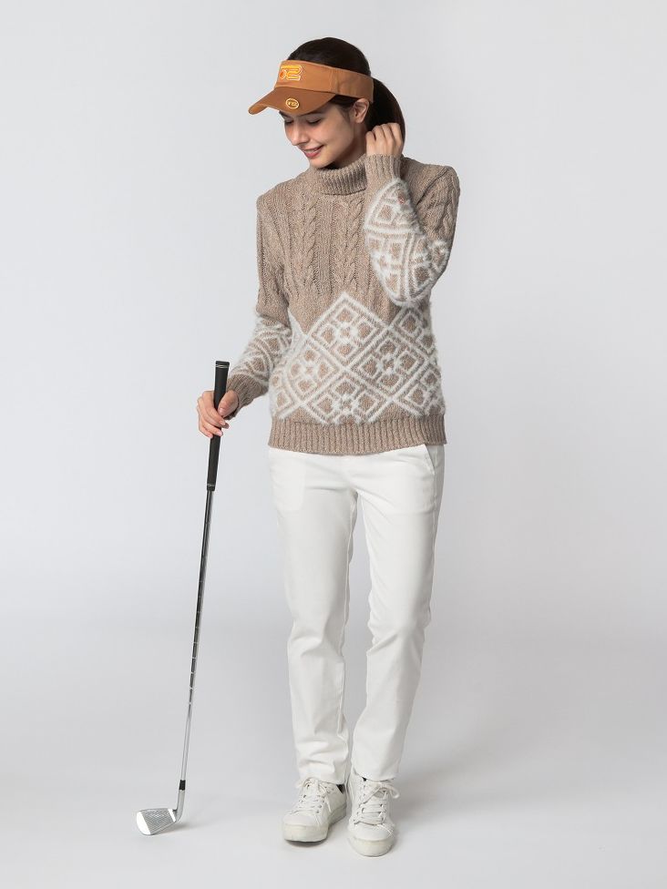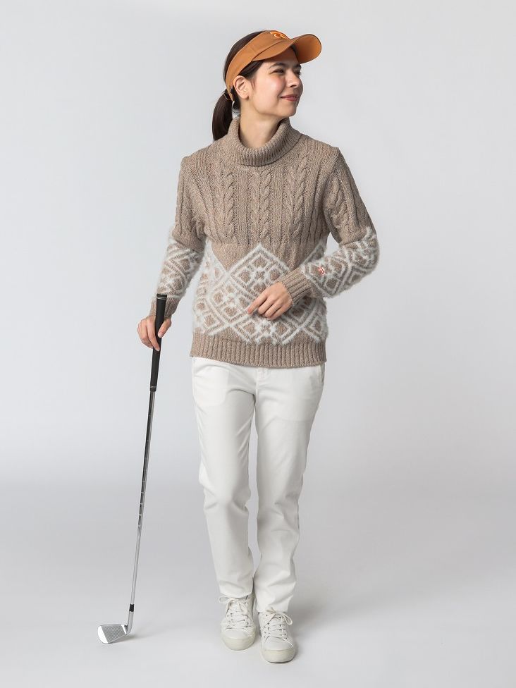 ローゲージのネップニットを使用したカジュアルゴルフスタイル。ニットはウール調ながらポリエステル糸を使用しているためイージケア性に優れる。パンツもストレッチ性に優れ、機能性もしっかりと備えたスタイリング。