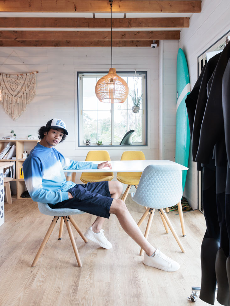 スウェットは吸水速乾機能を持つ裏毛素材を使用し、製品洗いをかけたカジュアルでキレイ目なリヨセル素材を合わせてラフでゴルフ場映えするロサーセンらしいカジュアルコーディネート。