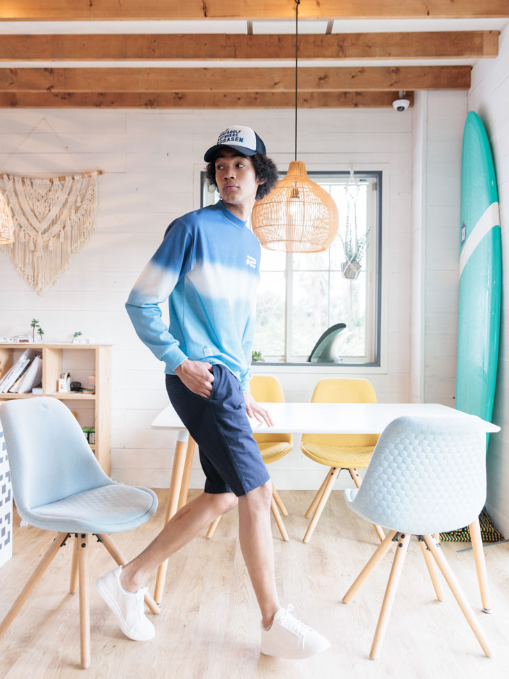 タイダイ風のグラデーション柄のモックネックスウェットと、定番のショートパンツを合わせたスタイル。