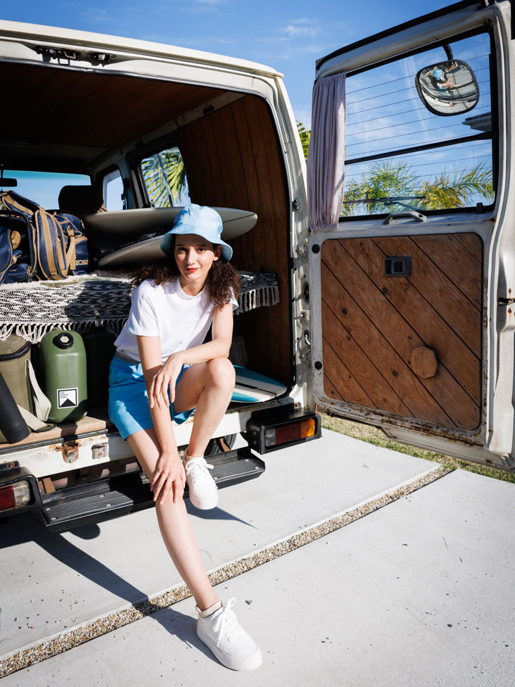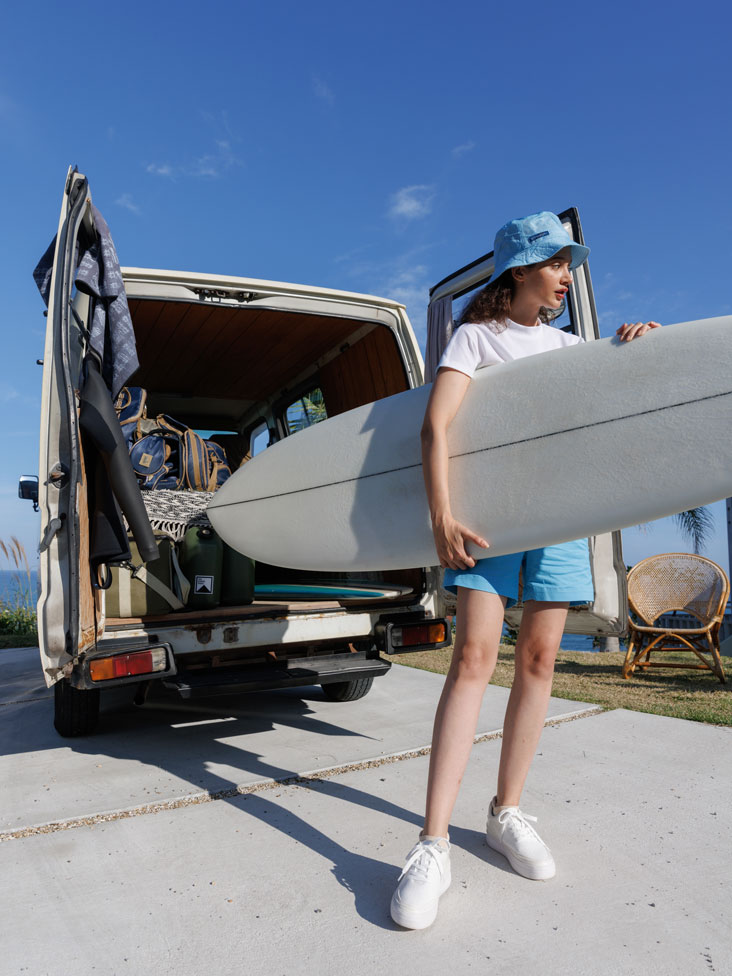 シャツは吸水速乾・UV・ストレッチ機能を併せ持つ鹿の子目のエコ素材を、ショートパンツは肌当たりが良く、ストレッチが効いたロサーセン定番のチノ素材を使用。シャツのバックプリント、バケットハット、パンツのカラーを合わせ、白とブルーのコントラストが爽やかなロサーセンらしい夏の定番コーディネート。