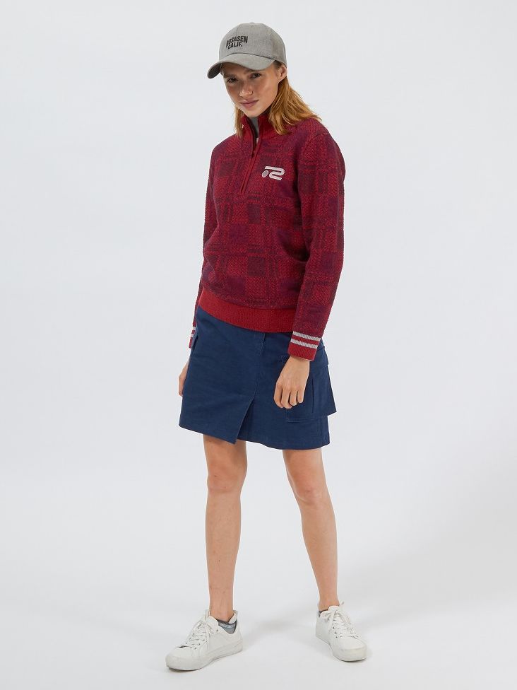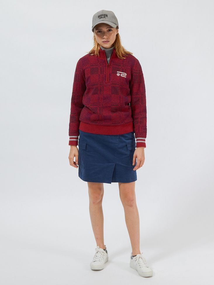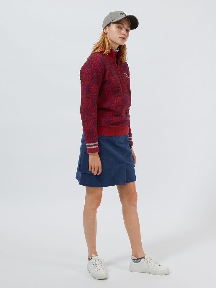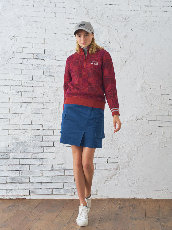 チェックをジャカードで表現したニットブルゾンにコーデュロイスカートを合わせたカジュアルスタイル。ブルゾンはチェック柄を起毛させた毛羽感がサーフテイストのアイテム。防風機能の裏地付き。スカートは前開きが斜めに入ったデザインが特徴的なアイテム。