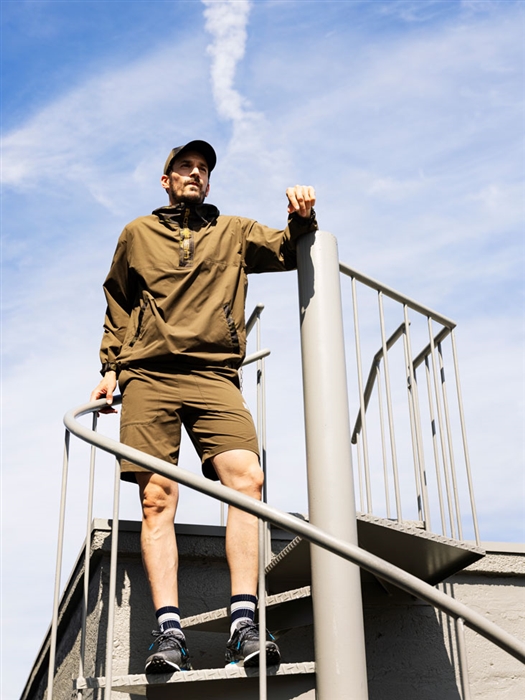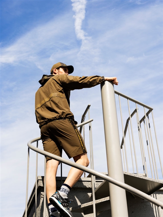 撥水とストレッチ性のある素材を迷彩タフタと組み合わせたボリュームのあるシルエットのアノラックと、同素材を使ったサイドラインが特徴的なショートパンツとのセットアップ。ドライタッチなモックネックと合わせる事により暑さが残る秋口の体温調整に最適。軽量で畳んで持ち運びもしやすく、ゴルフだけでなくタウンユースやアウトドアでも活躍できるオールラウンドなアウターとパンツはライトレインとしても活用できるコーディネート。同素材のキャップを合わせることでオールセットアップも可能。
