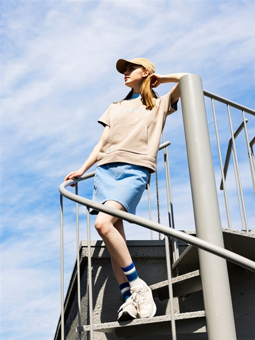 秋の打ち出し企画『オゾン加工裏毛シリーズ』の半袖プルオーバーと、ロサーセン定番のチノ素材スカートのスタイル。プルオーバーは表面には綿、裏面には肌離れがいいポリエステルの裏起毛素材を、スカートは微起毛加工で肌当たりの良さや柔らかさ、ストレッチが効いた素材を使用。インナーのシャツは吸水速乾・UV・遮熱・ストレッチ機能を併せ持つ鹿の子目のエコ素材を使用。インナーとプルオーバーのロゴ、スカートのカラーを合わせたロサーセンらしいカジュアルコーディネート。