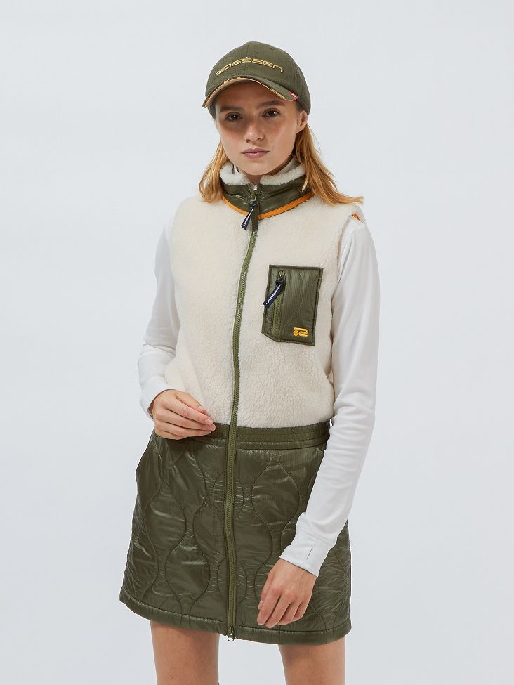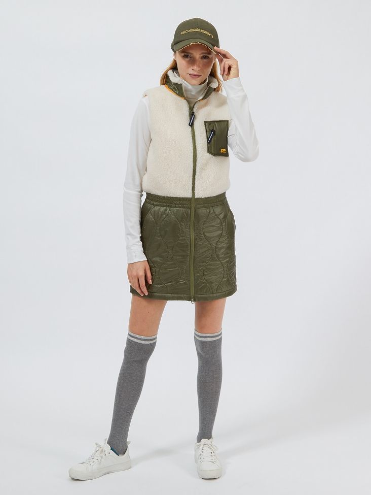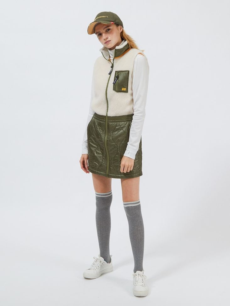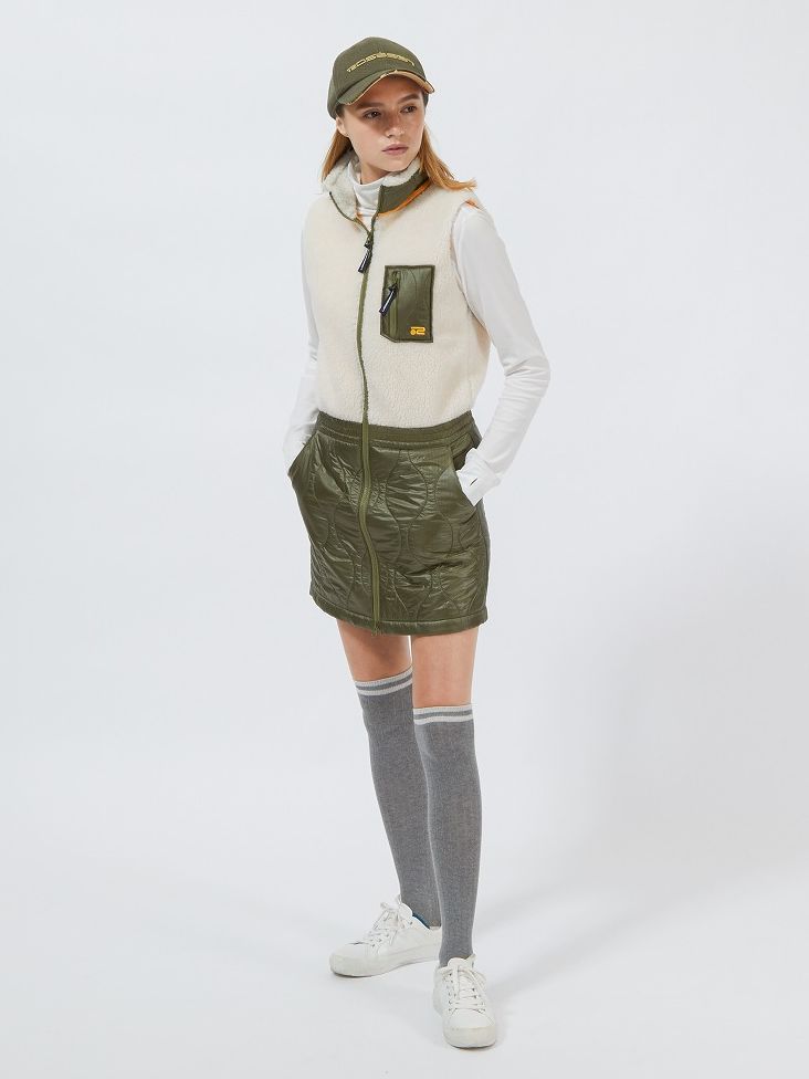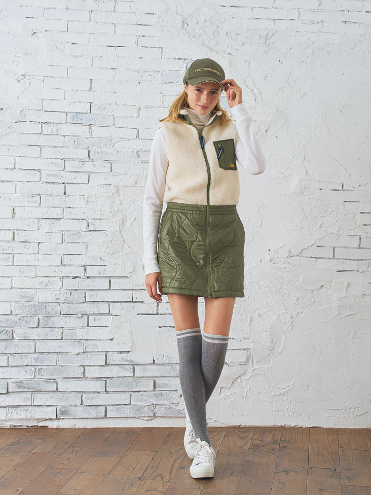 リップストップのキルティングを組み合わせたボアワンピースを使用したコーデ。裏地にタフタや蓄熱の裏地をしようすることで防風性と保温性を向上させたアイテム。一枚で特徴のあるアイテムなので裏起毛の防風インナーをシンプルに合わせ、スタイリング。