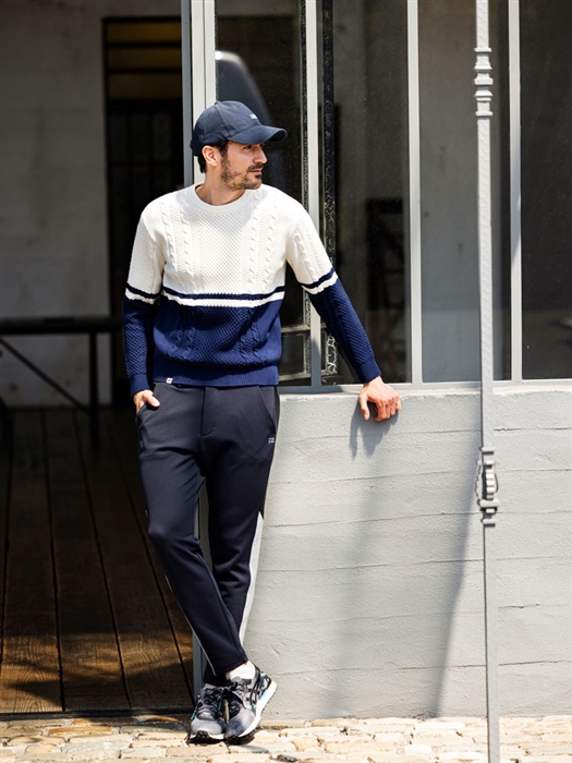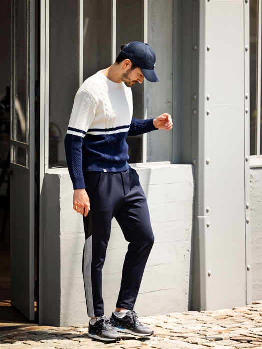 空気の層を多く含み、ソフトな風合いで秋から冬まで来て頂けます。ケーブルとバイカラーを組み合わせたデザイン一枚で決まるアイテムになっています。真冬には防寒のタートルネックと合わせてコットンのしっとりとした自然の着心地の良さを体感できる一品です。パンツは耐久性の高いナイロン糸“コーデュラ”を編み込んだ、アクティブシーンに最適なコーデュラ裏フリースを使用。裏面は柔らかなフリースになっており、保温性も抜群です。配色の切り替えにはチンツ加工を施した光沢の効いたパーツにしてシャープな雰囲気をプラスしています。
