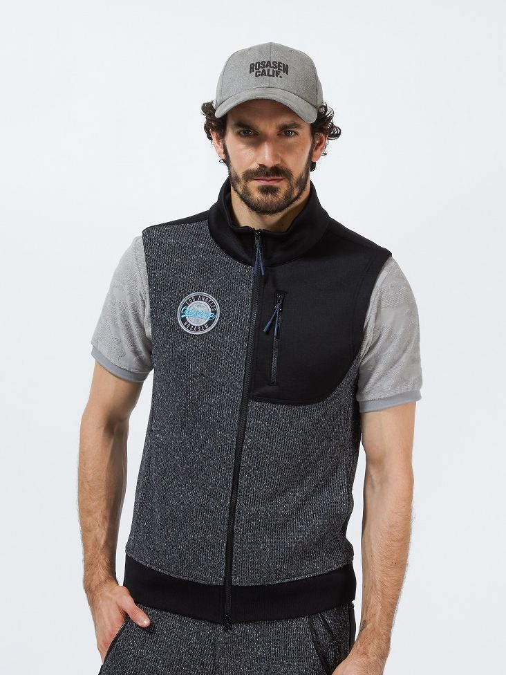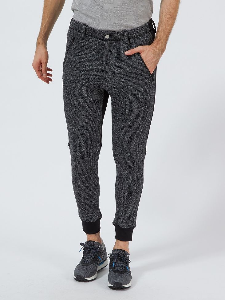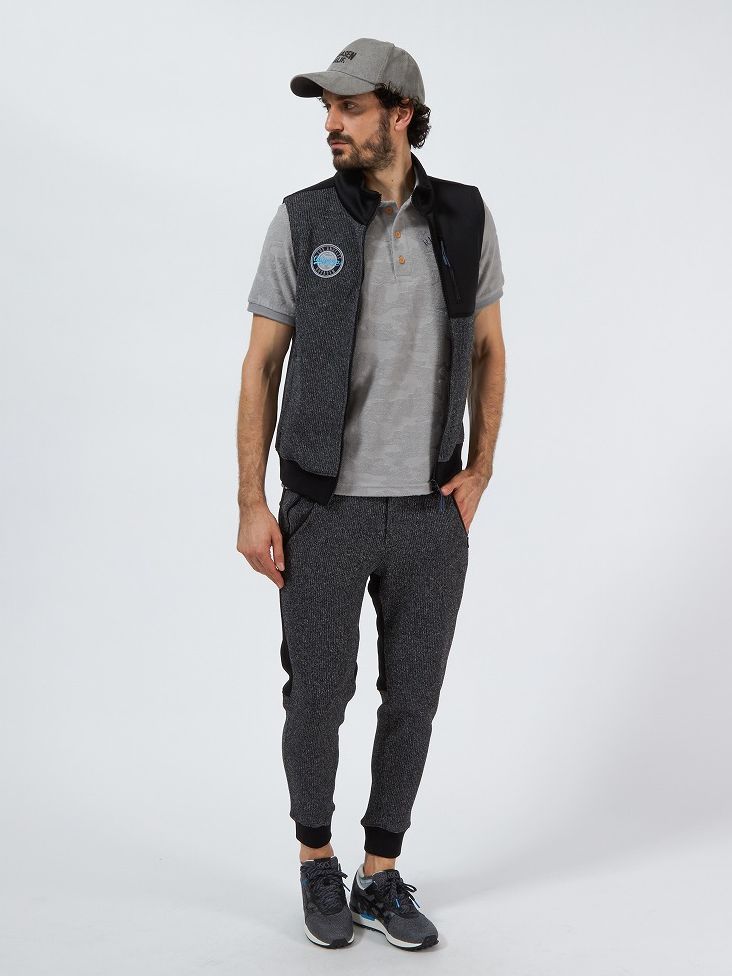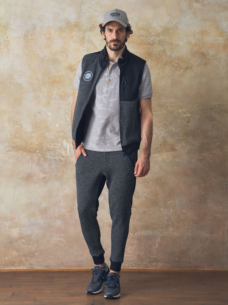 クォーターゲージのセットアップを使用したコーディネイト。ニットのような表面感ながら裏側をハイゲージにしているのでスポーツに適したハリ感も備えた素材。ベスト、パンツ共に軽量で通気性に優れた秋のラウンドに最適なアイテム。インナーのポロシャツ、キャップをモノトーンで合わせた大人のスポーティスタイル。
