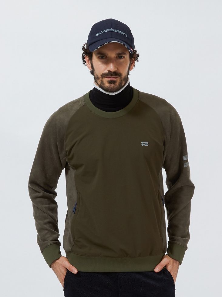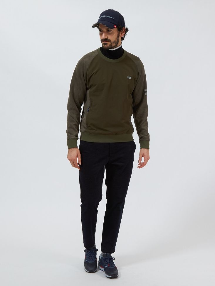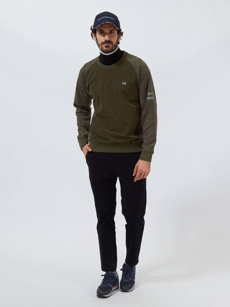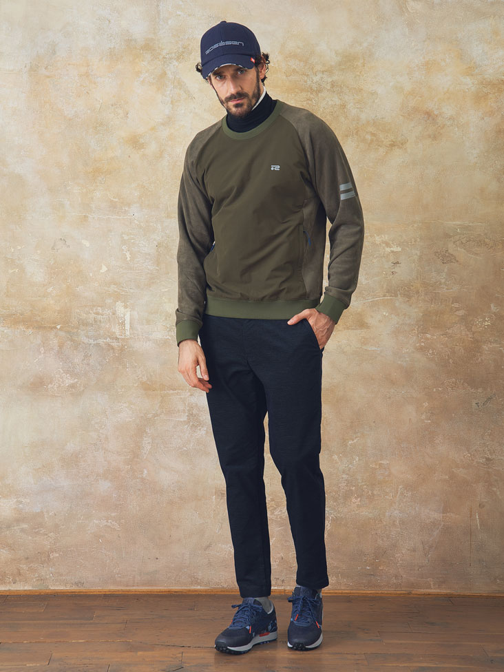 素材にスエード調のダンボールニットを使用することで、ポロシャツにスニードという定番の合わせに上質感をプラス。パンツも布帛見えのジャージ素材を使用しているのでストレッチ性に優れる。シンプルながら細かいポイントで他と差をつけたコーディネイト。