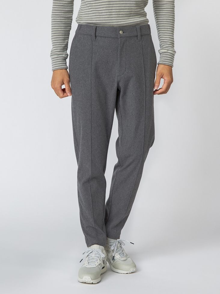 スポーティなデザインのプルオーバーにあえてクラッシクなウール調のピンタックパンツを合わせたミックスコーデ。パンツは少しゆったりとしたテーパードタイプでトレンド感のあるシルエット。プルオーバーの素材はテクノパイルと呼ばれるイタリアのポンテトルト社のフリースを使用。通常よりも目を詰めることで、保温性と防風性を向上させた機能素材。