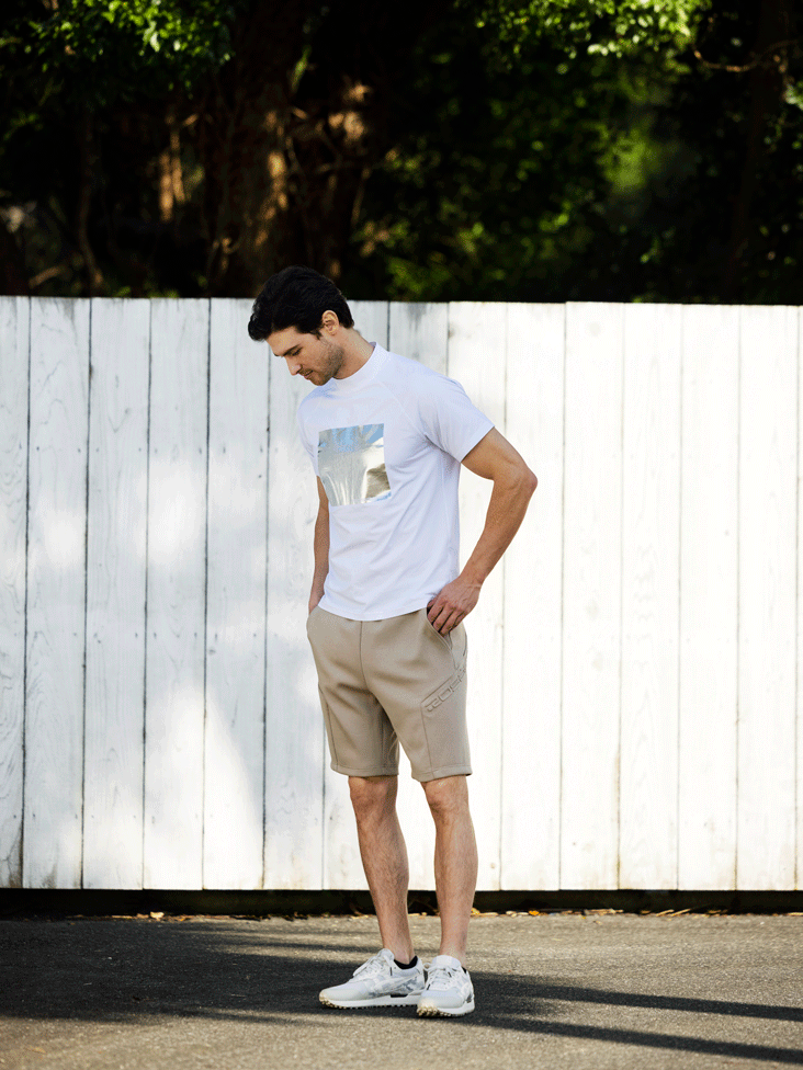 ポイントは、胸元に施されたトレンドの箔プリント。シンプルながらも存在感を放ち、コーディネートに都会的なエッジをプラスします。モックネックデザインが洗練された印象を与えボトムスには、ダンボールニット素材を使用したハーフパンツをセレクト。軽い履き心地で、夏の暑さの中でも快適さをキープします。トップスの白、ボトムスのベージュという落ち着いたカラーリングは、大人の余裕を感じさせる洗練された雰囲気のスタイリングです。
