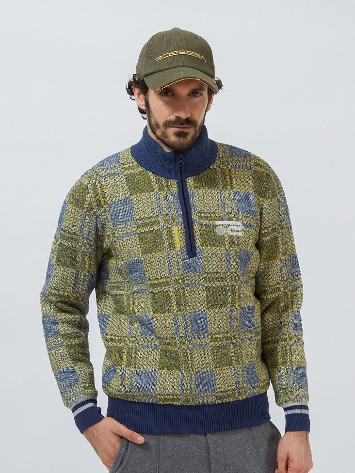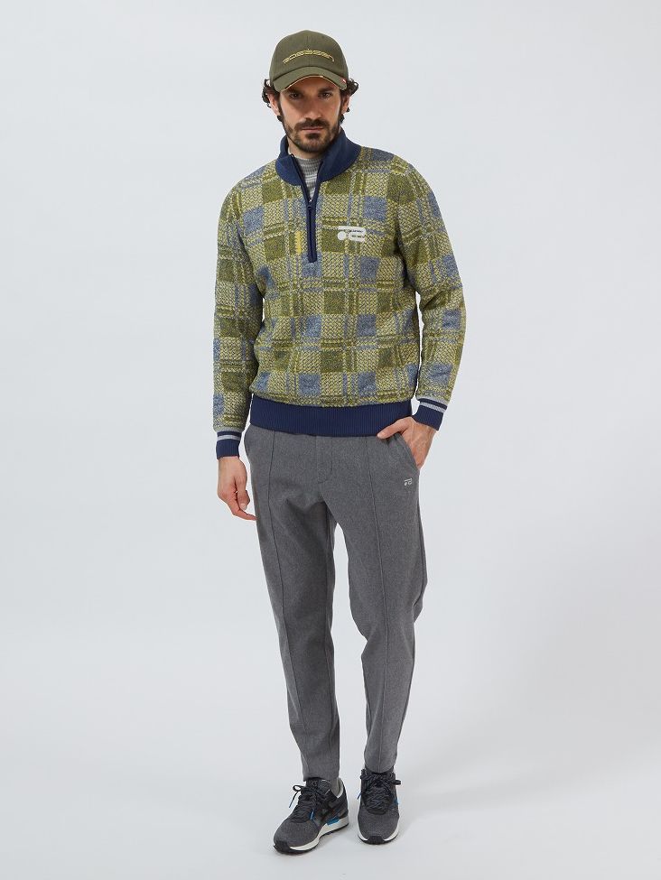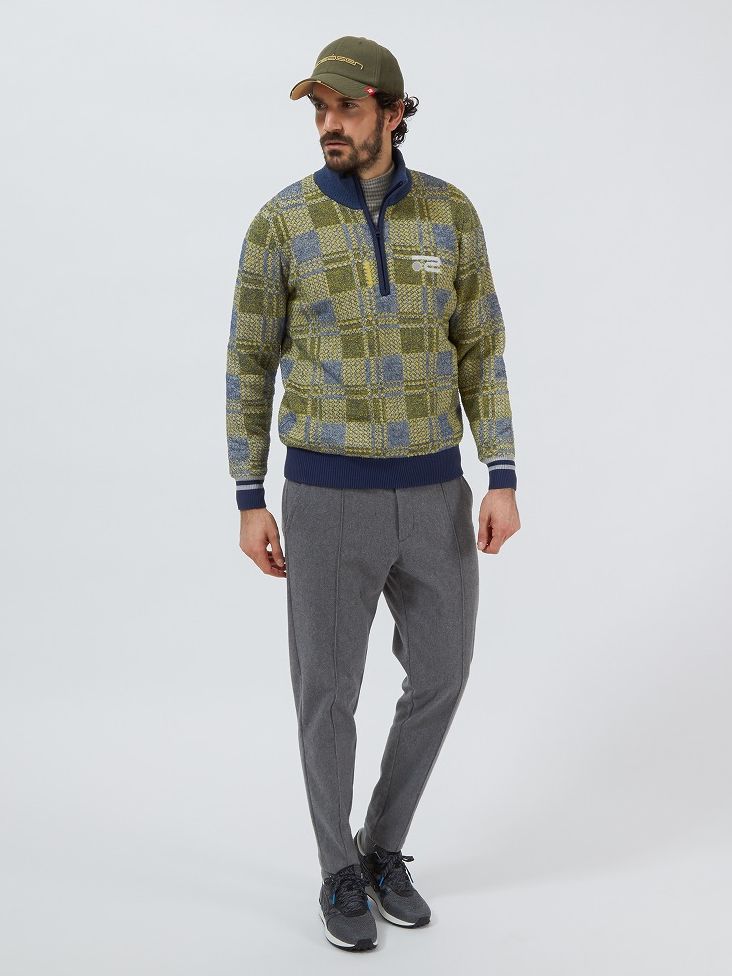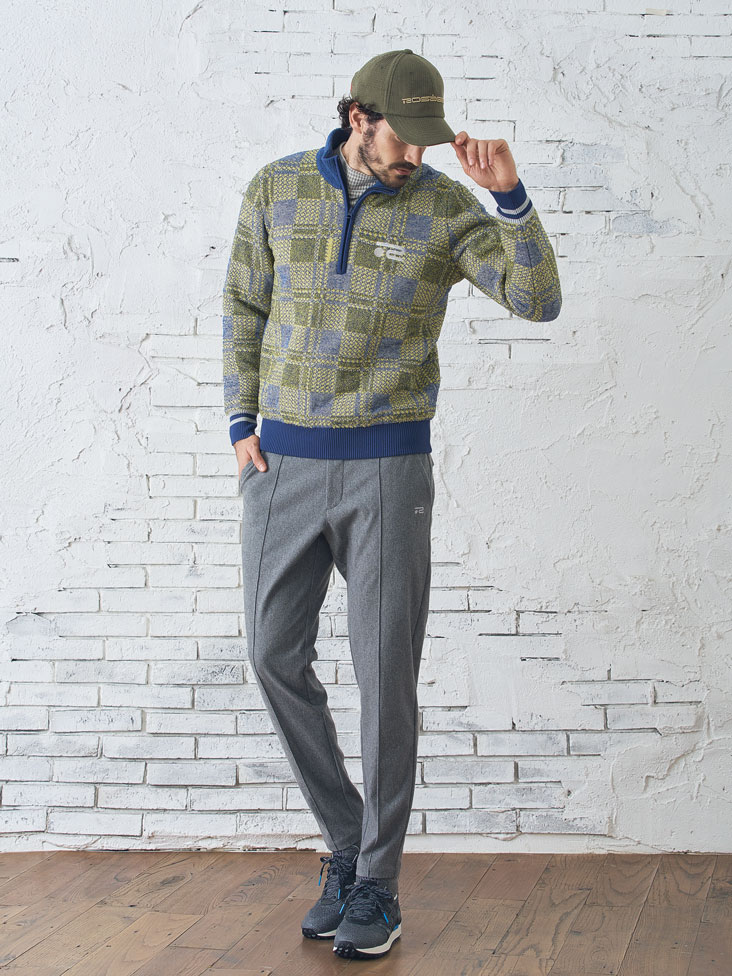 チェックをジャカードで表現したニットブルゾンにウール調のピンタックパンツを合わせたスタイリング。