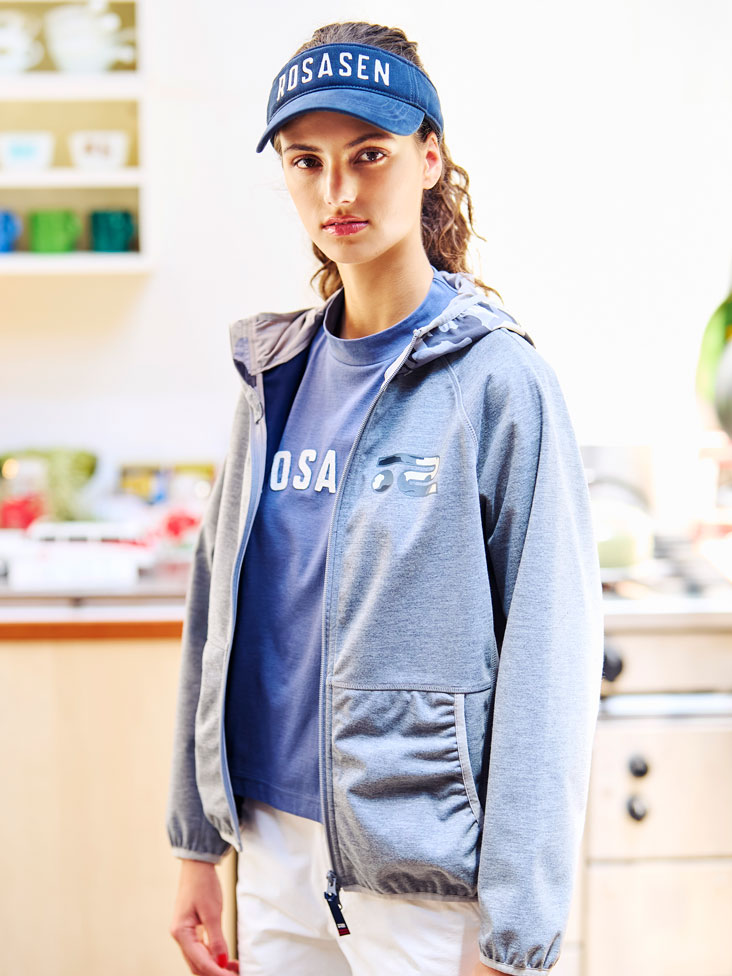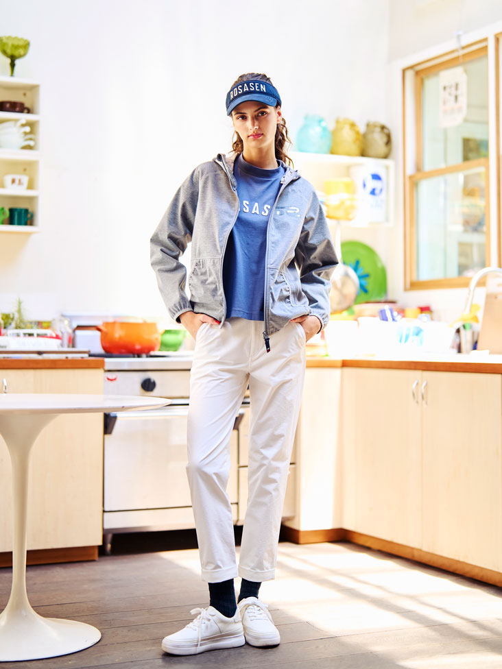 リラックス感と機能性を兼ね備えたカジュアルなコーディネートが特徴です。ブルーのロゴTシャツは、シンプルながらもフェルト刺繍のロゴがポイントになり軽やかな印象を与えます。その上に羽織ったグレーのフード付きジャケットは、肌寒い秋の朝や夕方にぴったり。動きやすい素材で、プレー中の快適さをサポートします。ボトムスには、ホワイトのテーパードパンツを合わせ、清潔感とスタイリッシュさを演出。胸元のロゴと合わせたバイザーを合わせることでまとまりのあるコーディネートに仕上がります。