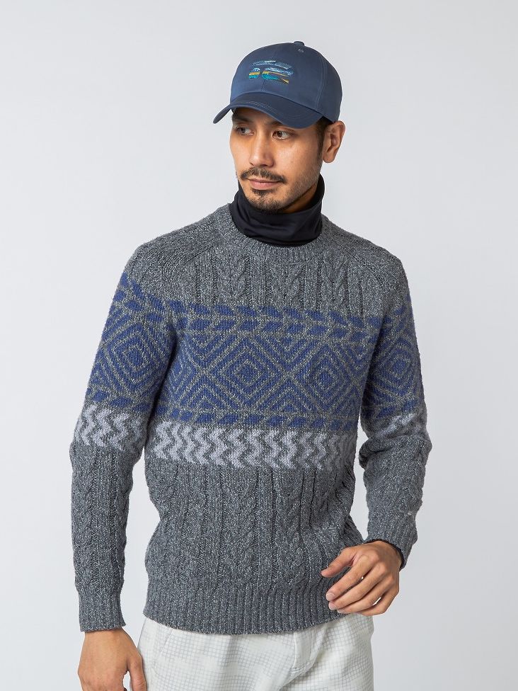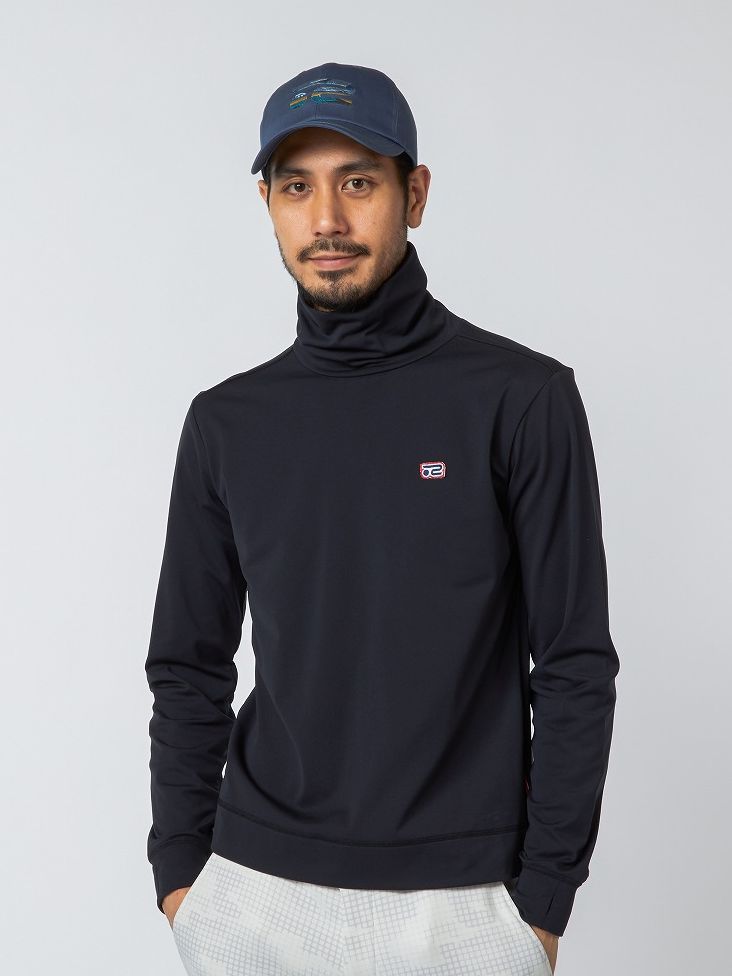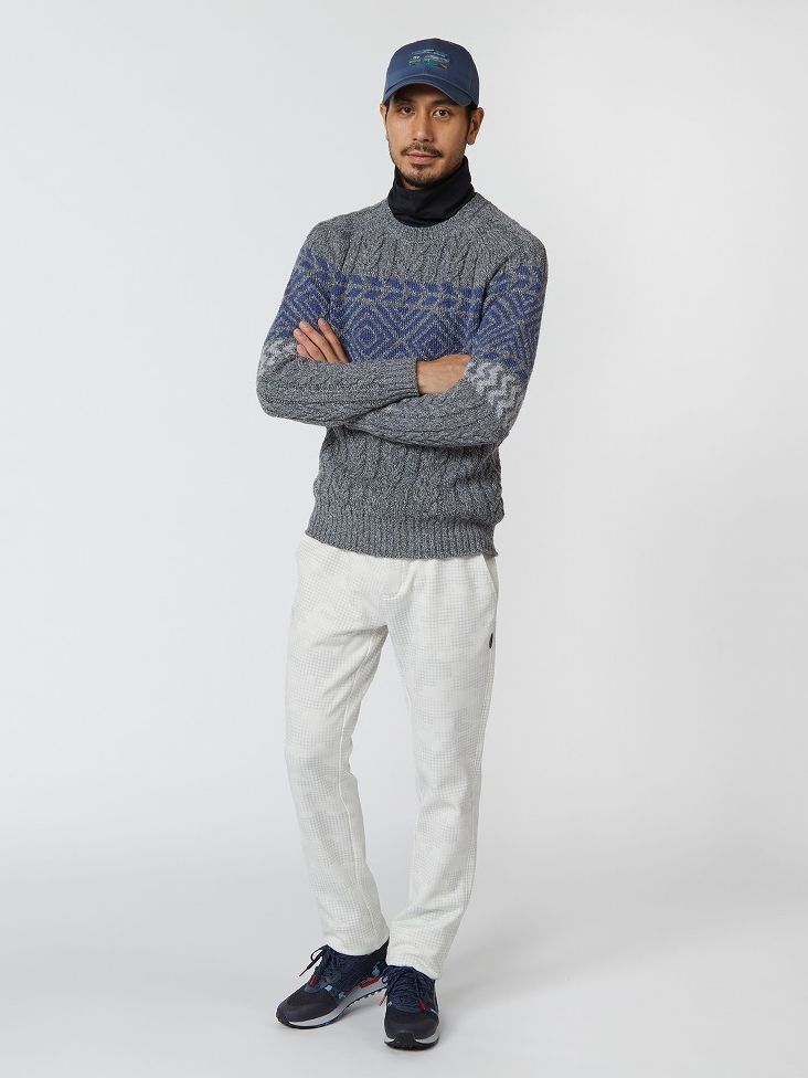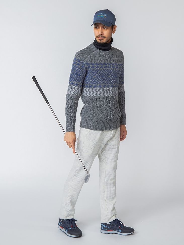 ローゲージのネップニットにハイネックインナーを合わせたコーディネイト。インナーは防風機能を備えた裏起毛素材なので真冬のラウンドにも最適。パンツもストレッチ性に優れ、軽量で保温性に優れた高機能アイテム。カジュアルながら機能性をしっかりと備えたスタイリング。