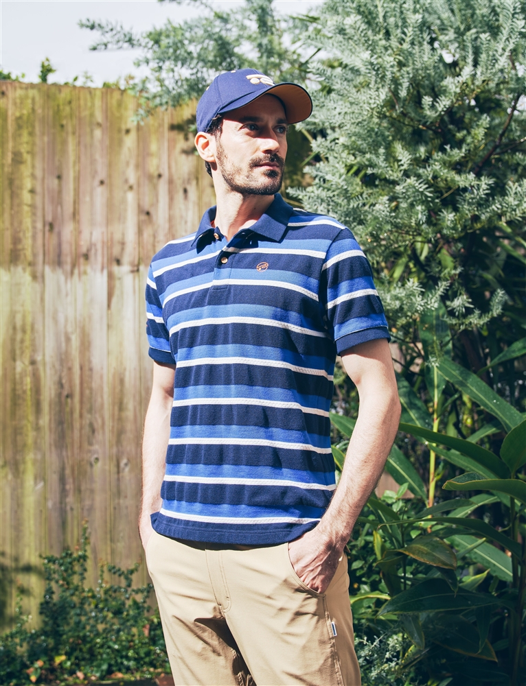 「太陽と遊ぶ」というコンセプトを持ったシェルテックパンツをメインにしたコーデ。吸水速乾やUVケアといった素材の機能に加え、使いやすいポケットやグローブホルダーなど、デザインでも機能性を考慮。トップスはサーフテイストでカジュアルなポロシャツを合わせることで、ゴルフはもちろん、アウトドアなど真夏のアクティビティでの着用も意識したコーディネイトに。