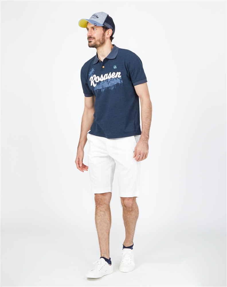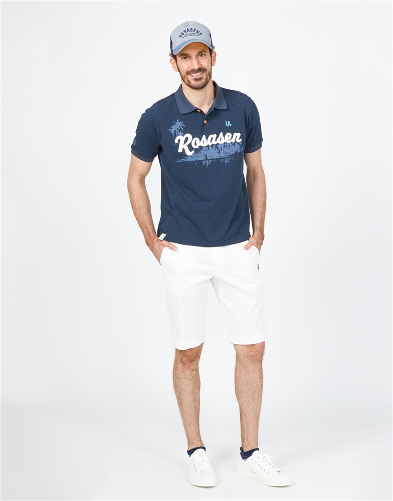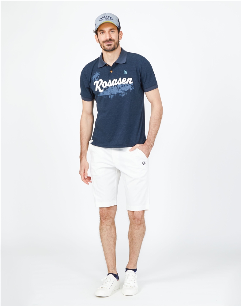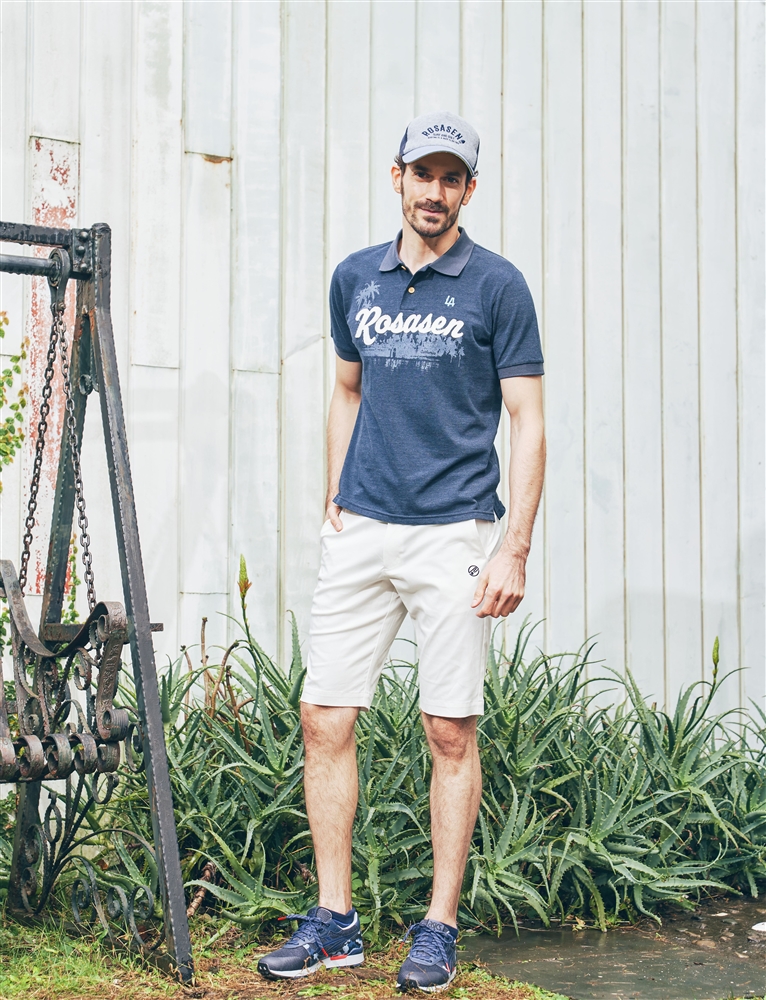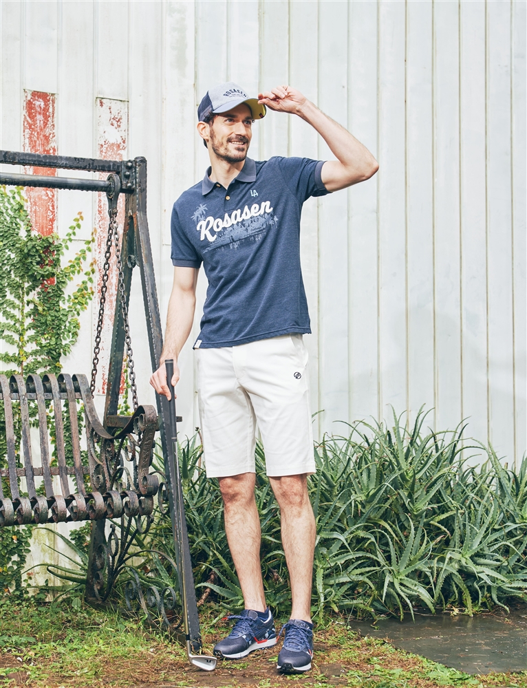 ヴィンテージのTシャツから着想を得たポロシャツをメインにしたコーディネイト。カジュアルなデザインのポロシャツにパンツをシンプルに白で合わせることで大人っぽさも取り入れたスタイル。
