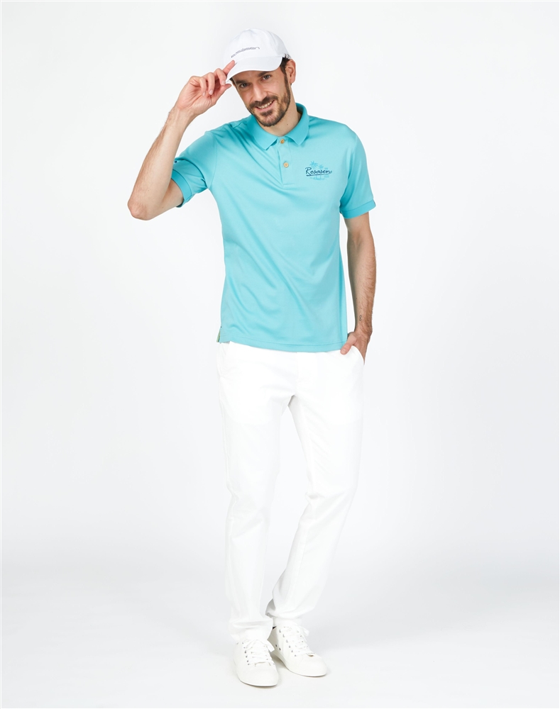 ポロシャツにチノパンを合わせた定番コーデ。シャツはエメラルドグリーンをチョイスすることで上品な印象に。パンツ、キャップをホワイトで合わせたきれい目なスタイル。