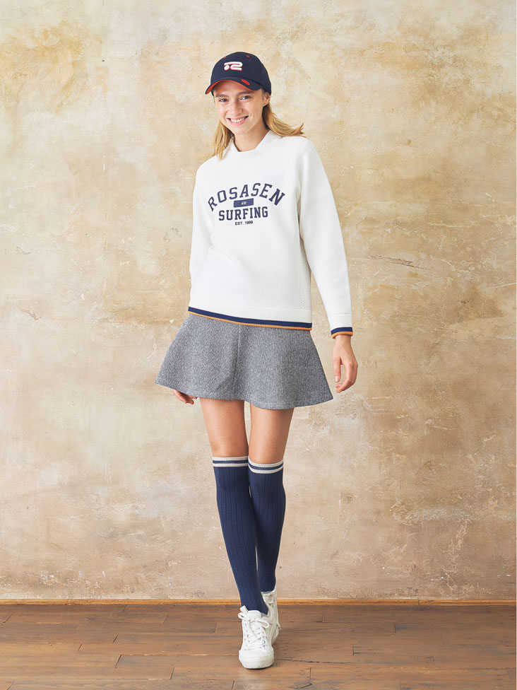 近年エコの観点からも注目されているホールガーメントニットをメインにスタイリング。フレアの入ったスカートを合わせることでより女性らしいスタイルに。ポロ衿を立たせた際に見える迷彩柄もスタイリングのポイント。