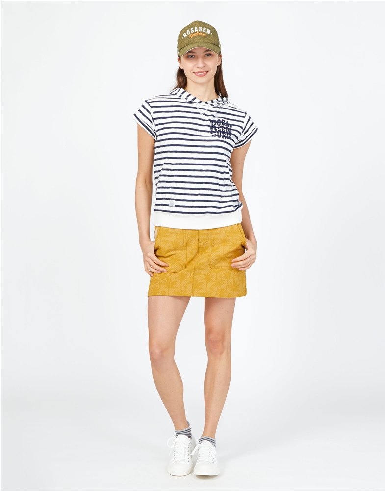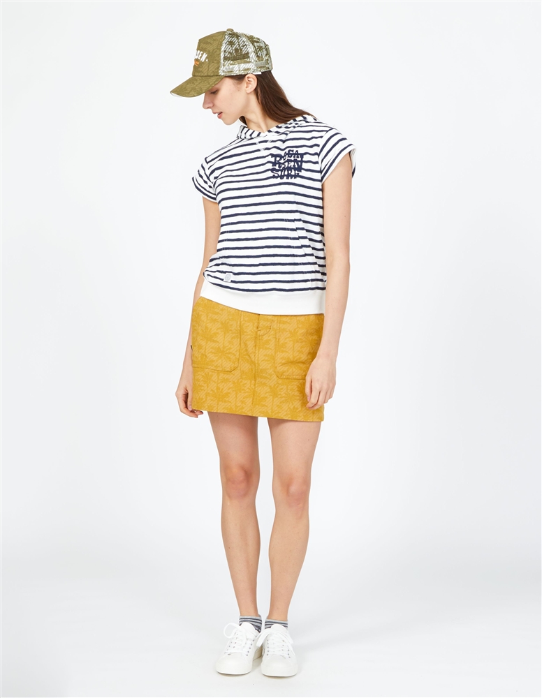 リゾート感のあるゆったりとしたシルエットの半袖パーカーにリバーシブルスカートを合わせたスタリング。スカートにさりげなくプリントされたヴィンテージヤシ柄が大人っぽく上品な印象。キャップも同柄で合わせることでまとまり感のあるコーデに。